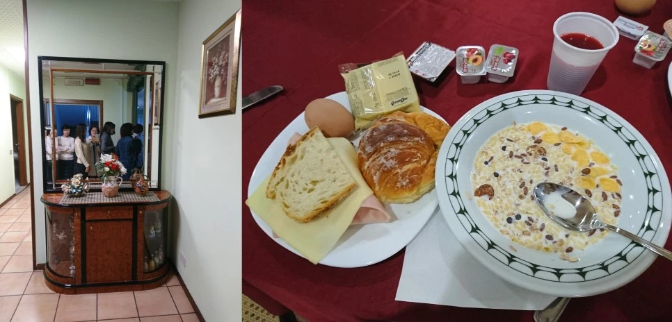 일단 빵이 담백하고 맛있다. 슬라이스 치즈와 햄, 시리얼과 우유, 주스와 커피 등 음료수, 여러 종류의 잼이 정갈하게 준비되어 있다.