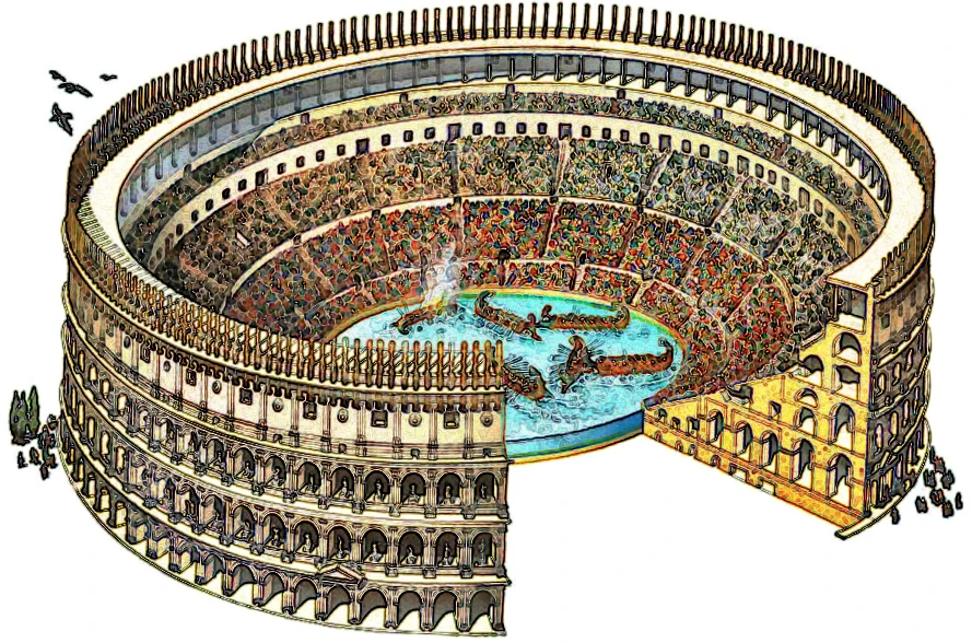 건설 초기에는 콜로세움 원형 경기장에 물을 채워 '나우마키아Naumachia'라는 모의 해전(模擬海戰)을 공연하기도 했다고 전해진다.