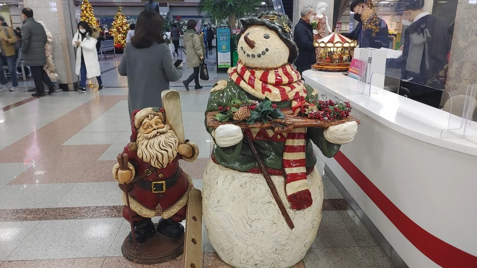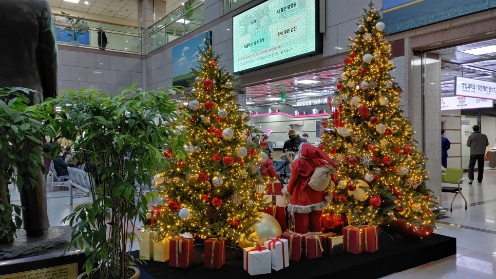 병원 입구에선 산타와 눈사람이 아픈 이들을 위로하며 맞는다.