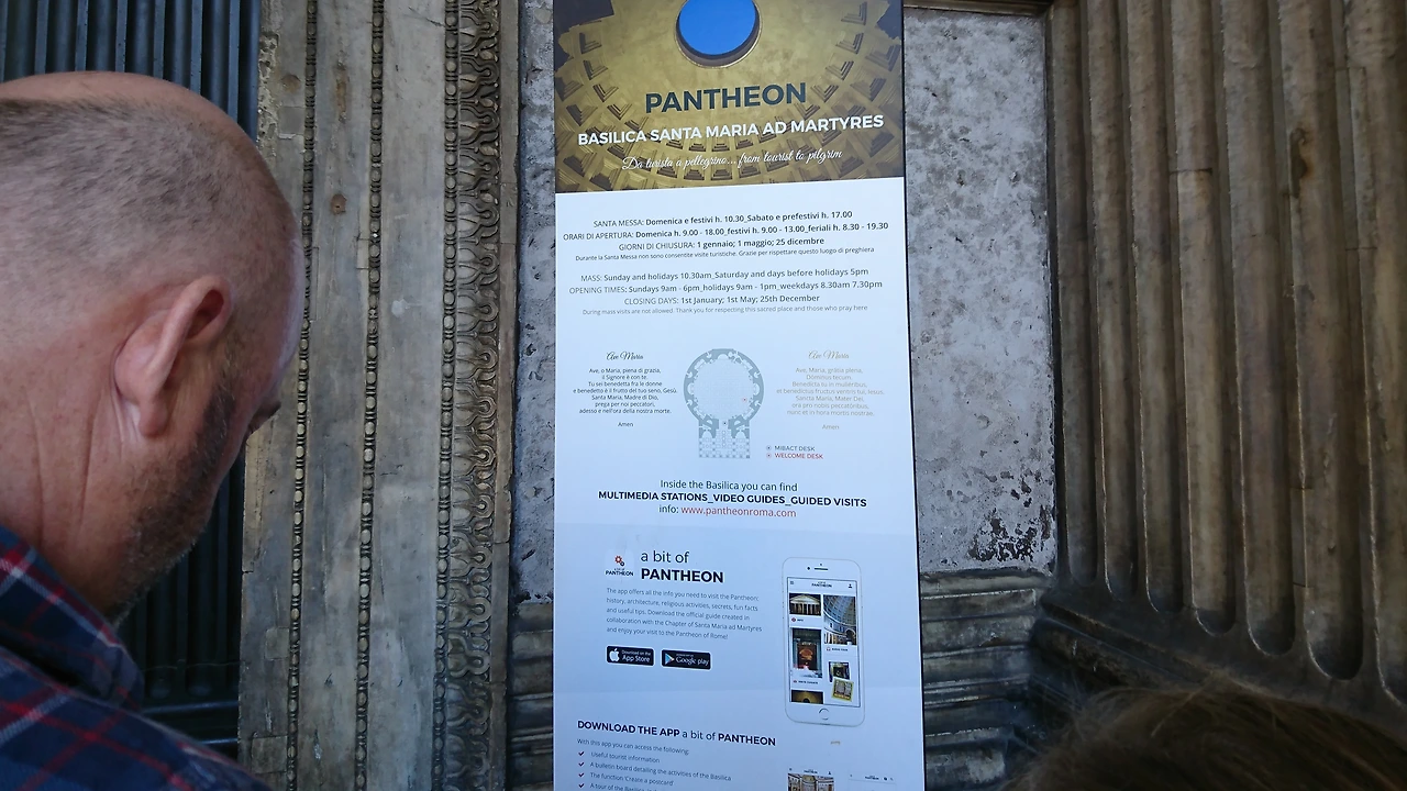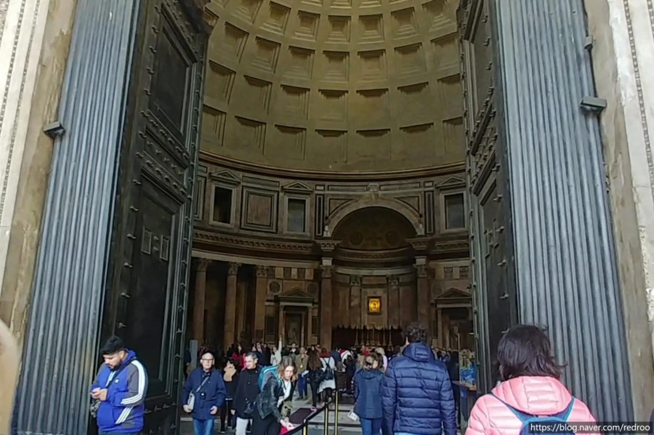 판테온의 그리스식 입구는 북쪽을 향하고 있다. 4세기경에 증축되었으며 코린트 양식 기둥이 웅장해 보인다. 터키 이스탄불의 아야 소피아 박물관과 함께 석조 돔으로는 세계 최대 규모다.