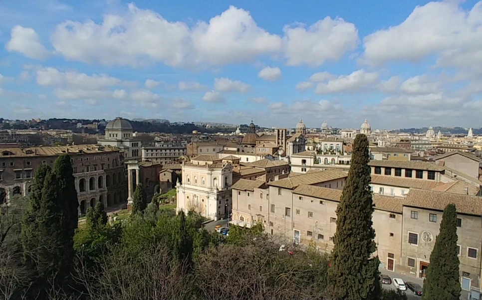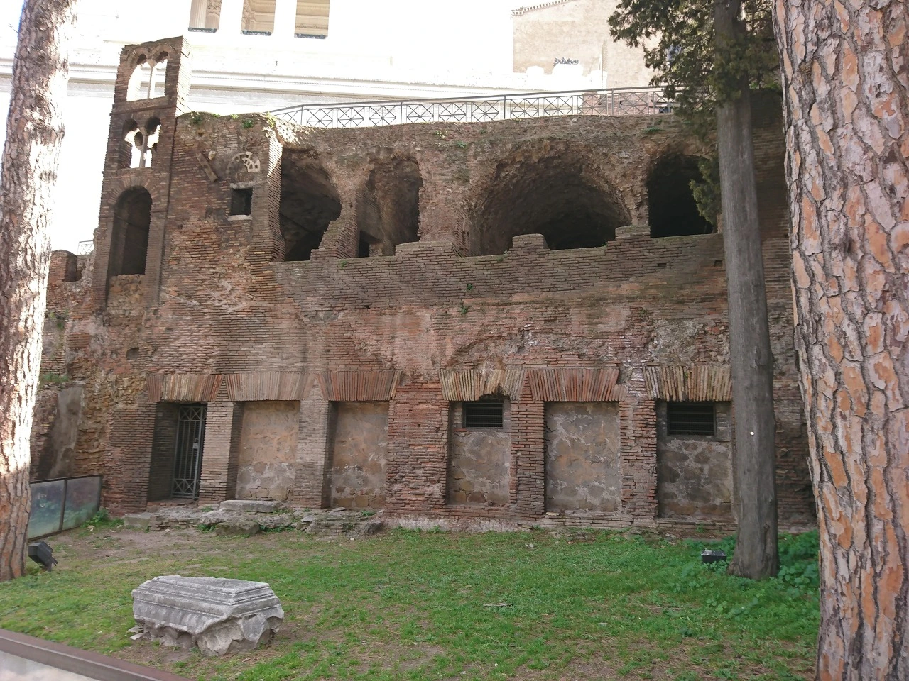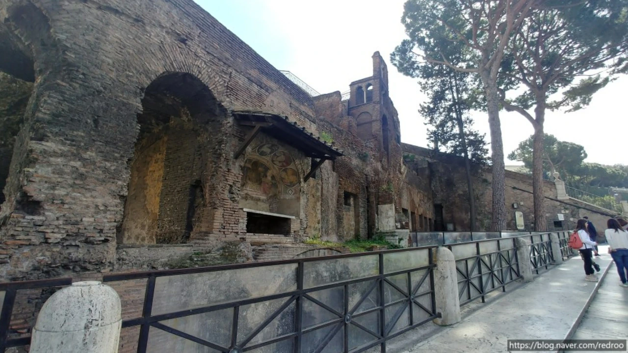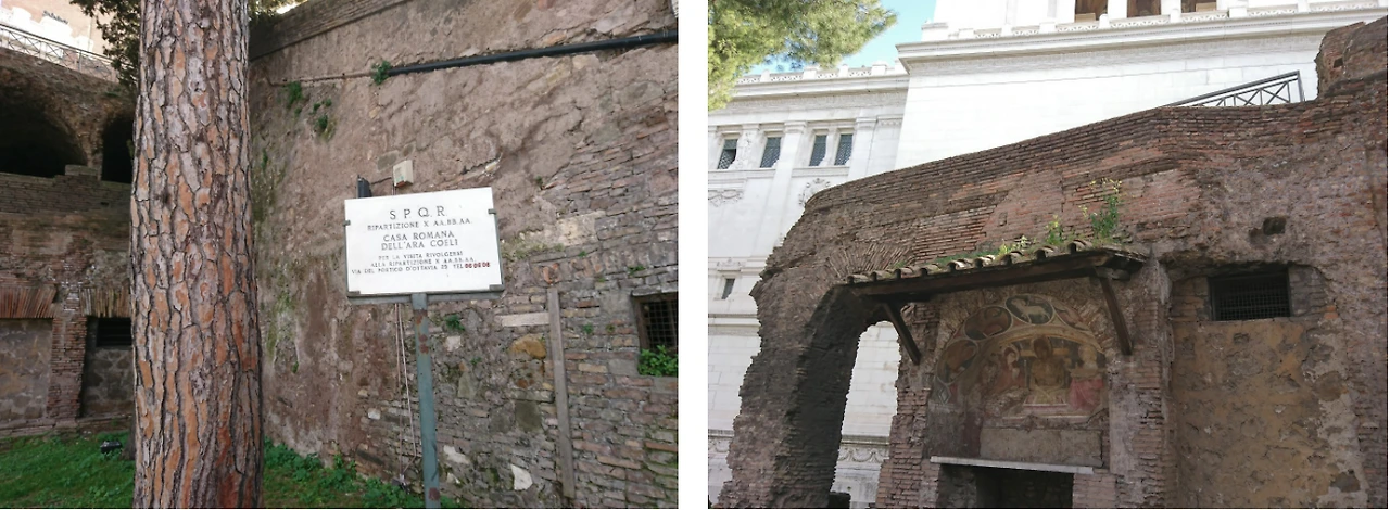 캄피돌리오 언덕을 둘러보고 조국의 제단과 베네치아 광장으로 내려가는 중이다. 오른쪽으로 아라 코엘리의 성모 대성당이 있고, 그 바로 아래 낡아 보이는 유적지가 눈길을 끈다. 대성당 아래로 허물어진 건물 2채(아래 사진)가 보이는데, 남아있는 기둥과 초석은 아직도 단단하고 튼튼해 보인다. 이 유적지는 로마 시민들이 아파트로 사용했던 건축물이다.