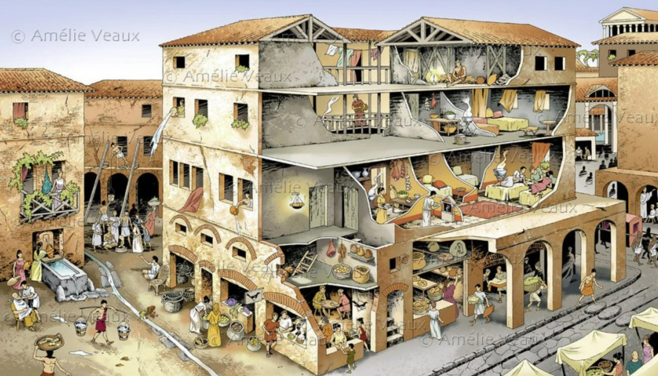 로마 인구는 재정 시대 후 급증하게 된다. 다세대 주택인 인술라로마나는 많은 인구를 한정된 공간 안에 수용하기 위한 통치 수단이었다. 게다다 당시 부유한 귀족들은 이런 인술라를 몇 채씩 사들여, 임대업으로 돈을 벌었다니, 정말 사람 사는 탐욕스러운 모습이야말로 고대나 현대나 똑같구나! 건물주 되는 것이 우리나라 많은 사람들에게도 로망이라던가!