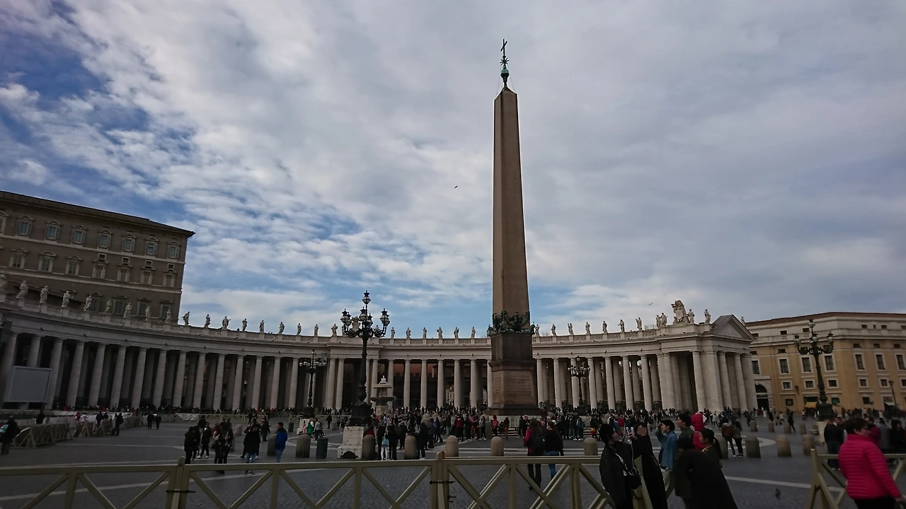 이 오벨리스크는 1586년 교황 식스토 5세 지시로 기술자이자 건축가인 도 메티 코 폰타나가 지금의 위치로 옮긴 것이다. 베르니니는 오벨리스크 꼭대기에 십자가를 얹고, 성 베드로 광장 중심에 이 목격자를 그대로 세워둔 채 공사를 마무리했다. 주위에는 네 개의 기둥이 일렬로 서서 광장을 감싸도록 설계했고, 웅장한 도리스식 열주 위에는 가톨릭 성인들의 조각상이 줄지어 서 있다.