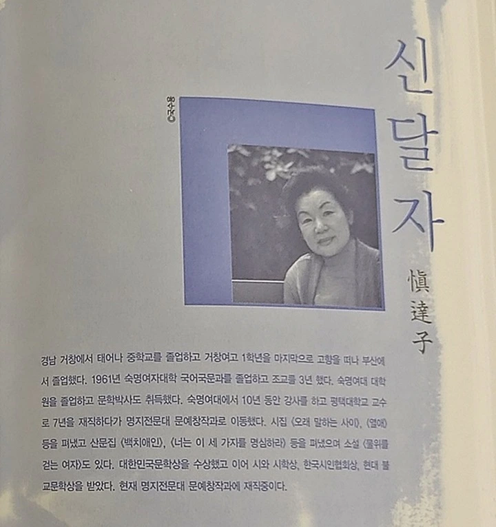 신달자 작가는 딸 부잣집 일곱 번째(현실적으로 다섯 번째) 딸로 태어났다. 이어 태어난 귀한 남동생에게 '엄마의 사랑과 관심'을 모두 양보하며 성장한다.