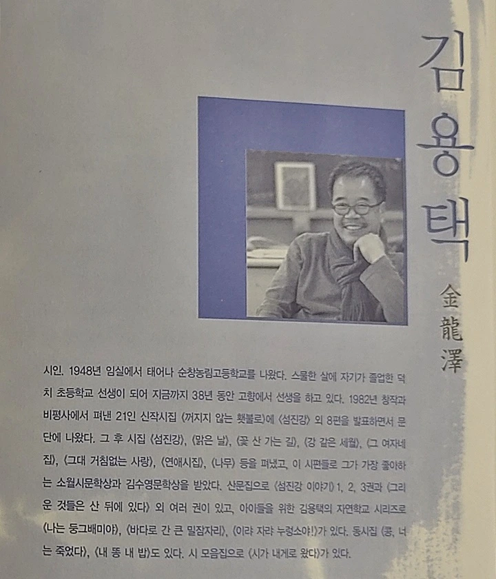 김용택 시인은 섬진강 하면, 가장 먼저 떠오르는 사람이다. 태어난 곳에서 성장하고 아이들과 함께 동고동락하며 책을 벗하고, 글을 풀어내는 시인의 모습이 인자하다. 자연친화적이며 서정적인 감성을 그대로 드러낸 김용택 시인의 글들은 소박한 시인의 모습과 딱 하나로 일치된다.