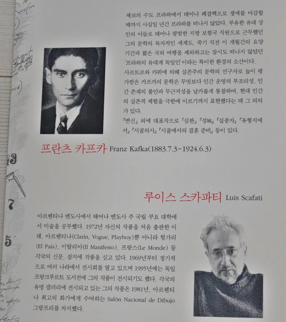 활자에서 생략된 채 지나친 주인공 그레고르의 섬세한 얼굴 모습을 가만히 들여다보면, '프란츠 카프카'의 갸름한 얼굴과 닮아 있다.