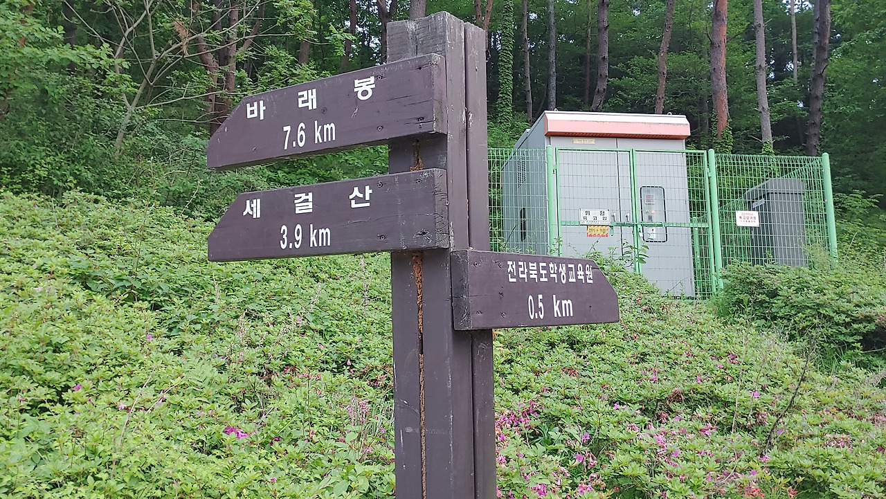 왼쪽이 우리 숙소어젯밤, 즐거운 시간을 보낸 백두대간 생태교육장을 지나쳐 뒷산으로 오른다.