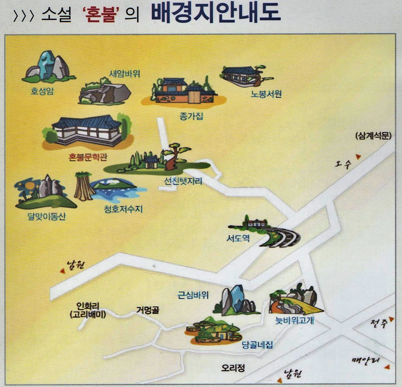 종가, 노봉 서원, 청호저수지, 새암 바위, 호성 암, 노적봉 마이애 불상, 달맞이동산, 서도역, 근심 바위, 늦바위고개, 당골네 집, 홍송 숲 등 마을 주변 장소가 소설 속에 그대로 살아있다. 노봉마을은 최명희 작가의 선조들이 500년 동안 자리 잡고 살아온 터전이기도 하다.