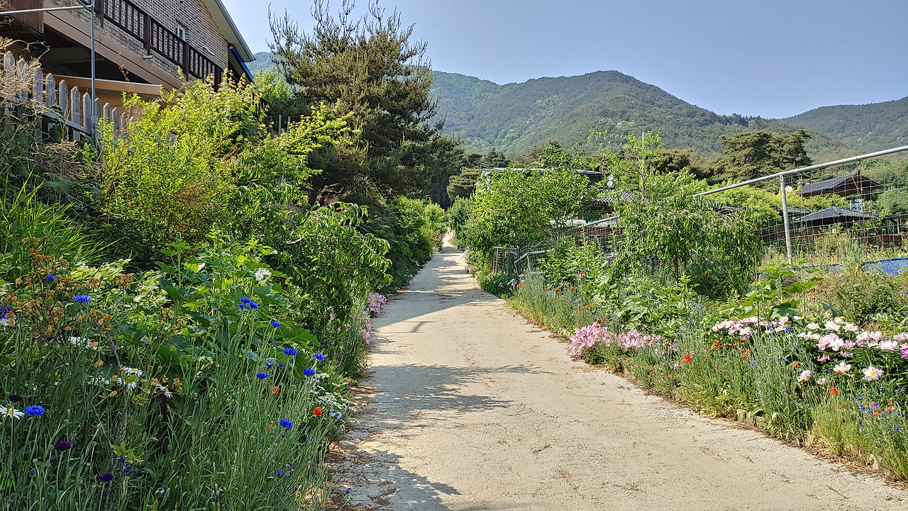 굽어진 둘레길은 심한 언덕이나 비탈도 없이 온화한 시골길 그대로다.
