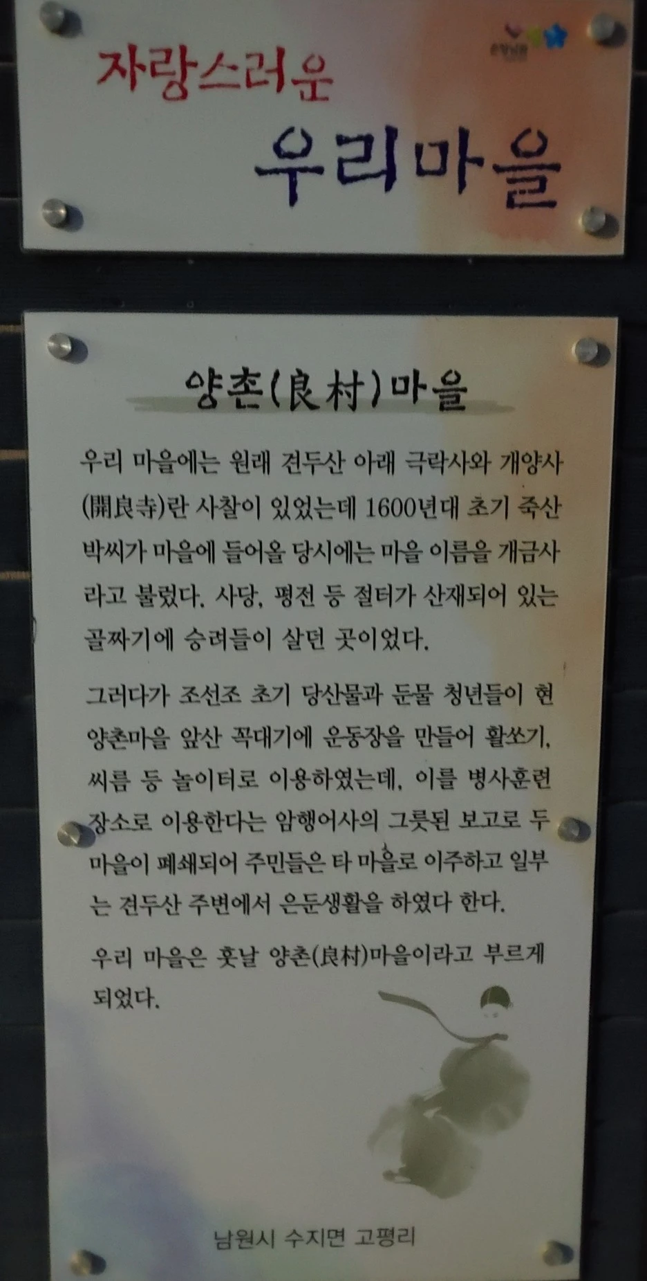 마을 앞산 앞 명당을 갈음수라 불렀다고 하는데, 갈음수(渴飮水)의 발음이 와전되어 '가랑수'라 하다 '양촌'으로 바뀌었다고 한다.