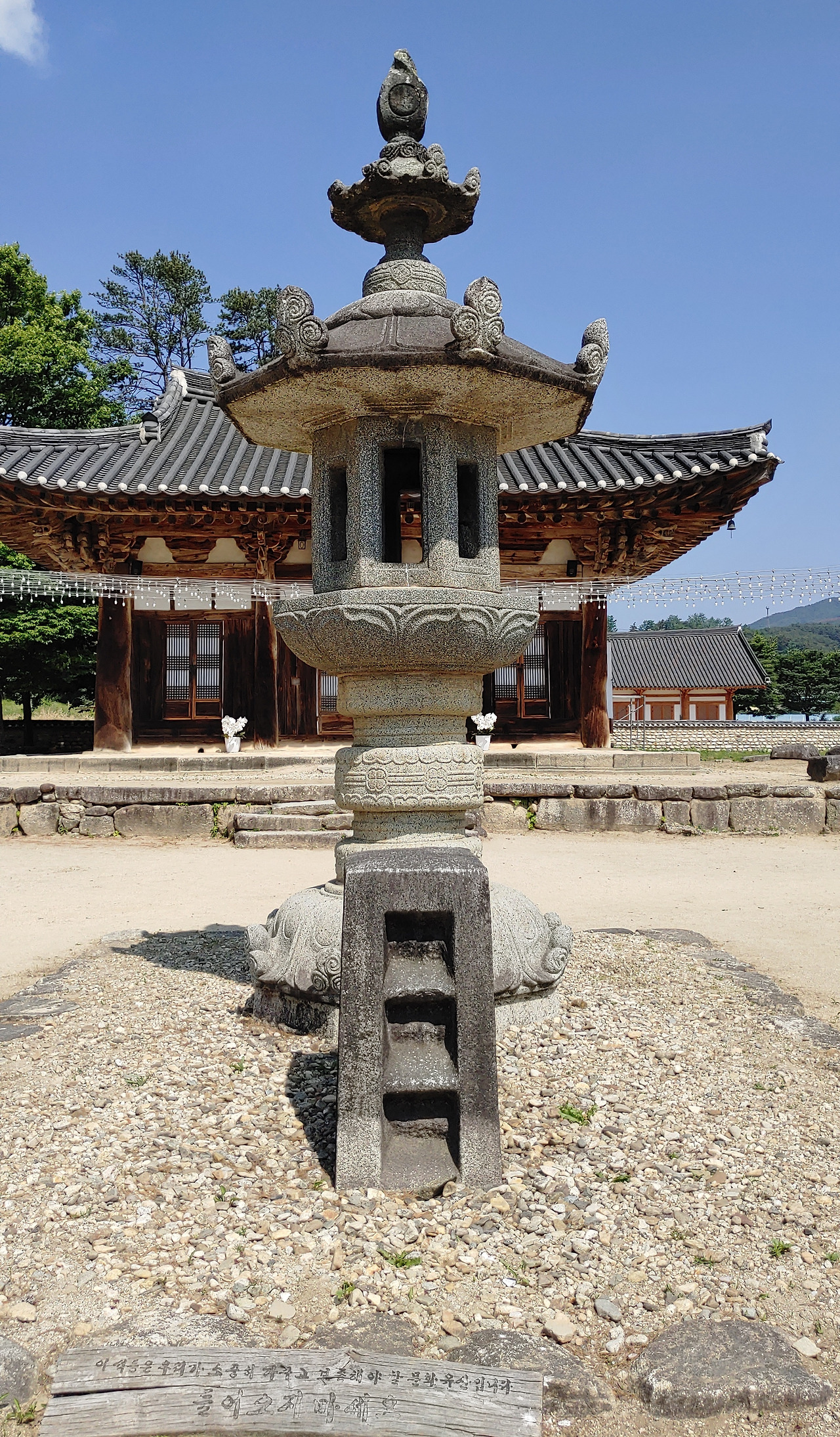 왼쪽부터 명부전, 석등, 오른쪽 삼층석탑, 범종각