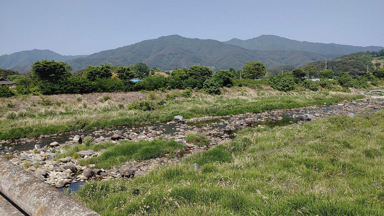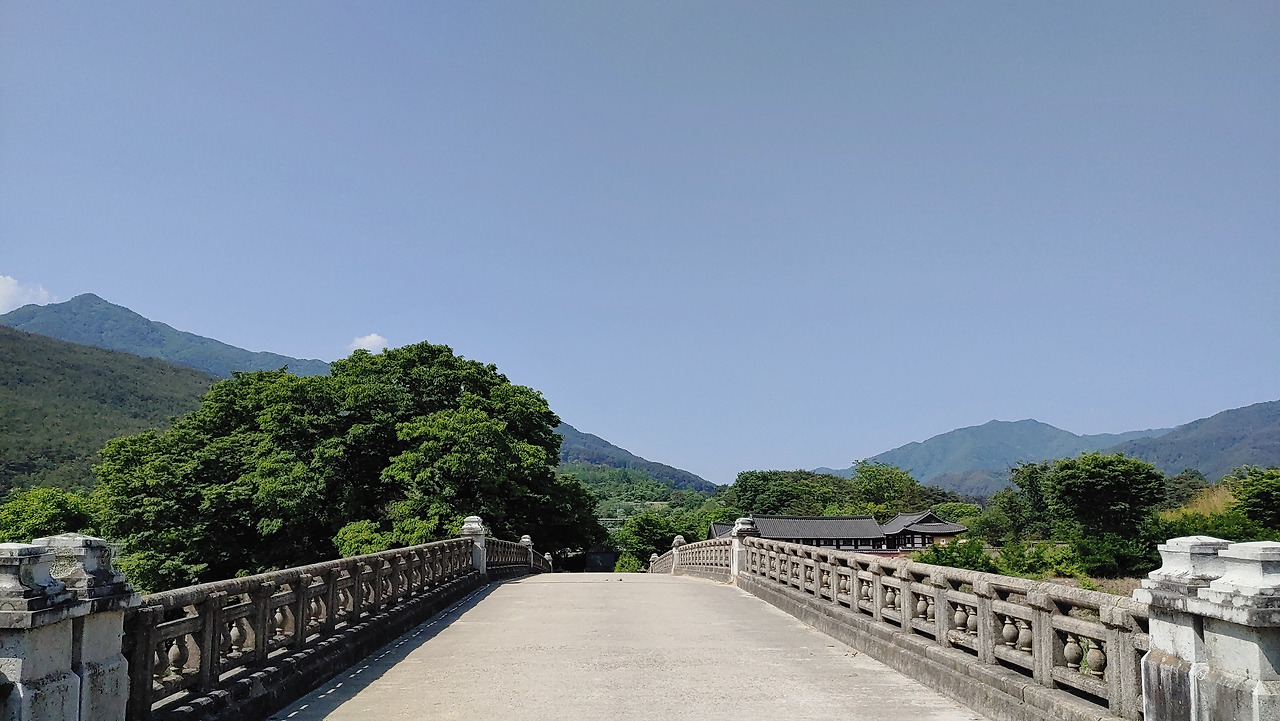 해탈교 아래로 흐르는 남천(5월 24일 당시 긴 가뭄으로 천의 수량이 부족한 상태)람천교 위에서 살짝 고개를 들면 아름다운 지리산 주능선이 쭉 펼쳐지는 장관을 마주하게 된다.