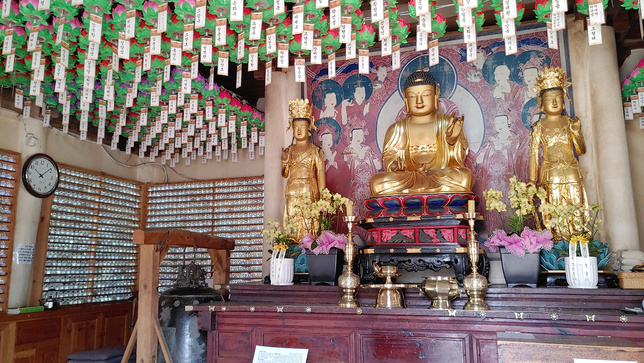 전각 안에는 통일신라시대, 철로 만든 약사 불상과 불상 뒤에는 조선 후기에 그린 약사 불화가 있다.