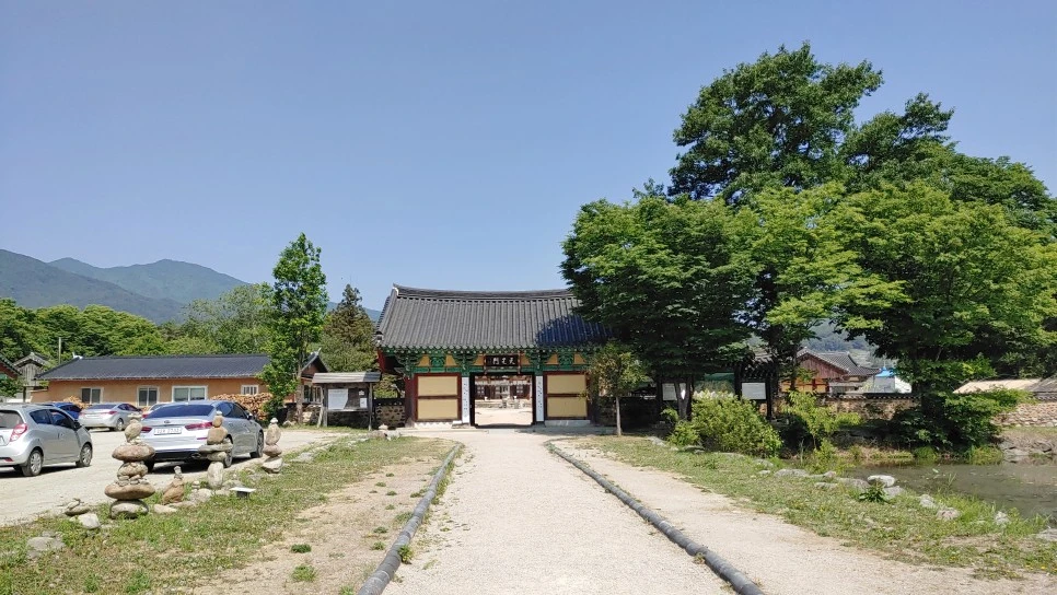 실상사 정문 앞, 오른쪽으로 보이는 휴휴당과 멀리 부드러운 지리산 능선