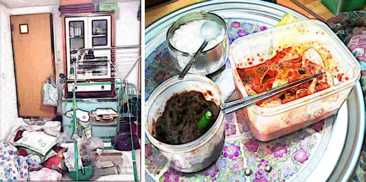 활동 당시, 한 어르신의 반지하 방 / 다른 어르신의 아침식사 식단(물 만 밥과 고추장+ 풋고추 한 개, 신 김치)