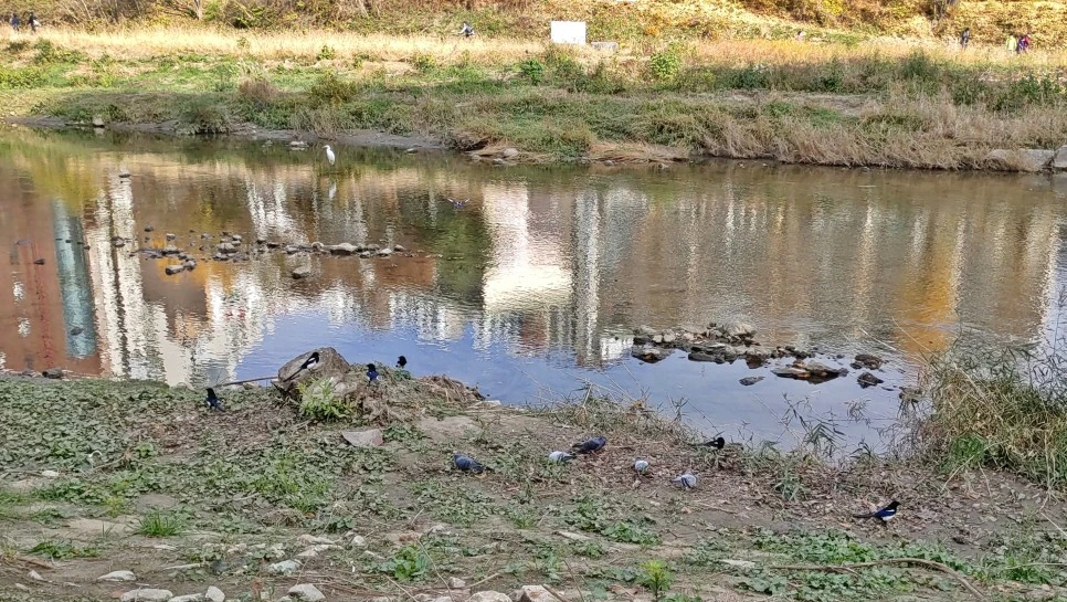 하천에서 백로 한 마리가 쉬고 있지만 천변 대부분에선 비둘기와 까치 떼만 몰려다니며 모이 찾기 바쁘다. 이들 개체 수가 작년 가을보다 더 많이 보였다.