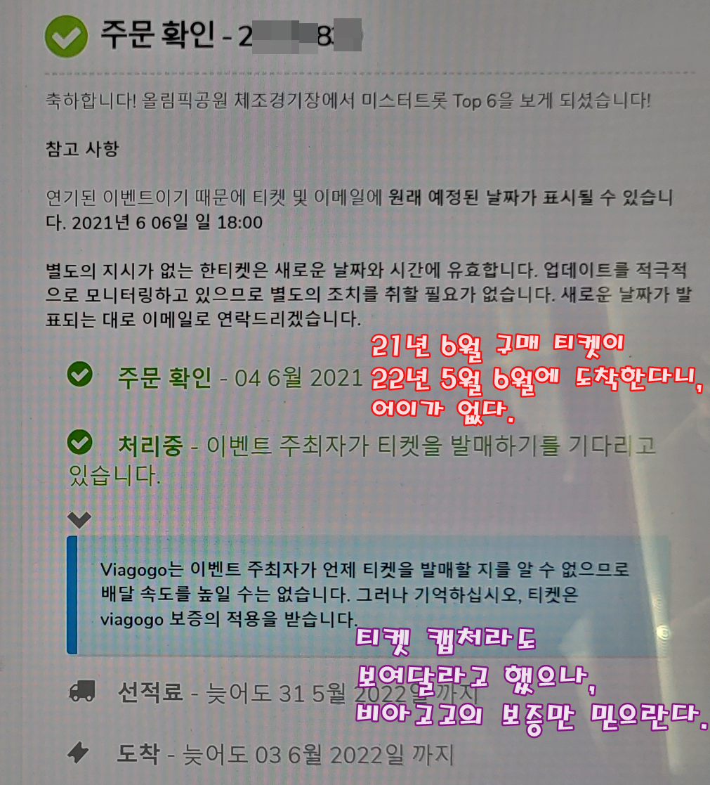 비아고고 '내 계정' 메시지난에 티켓을 보내달라는 내용의 글을 수십 번 올려도 매번 똑같은 폼과 비슷한 내용의 답이 돌아왔다. 내용 중, '여기 클릭'을 누르라고 하지만, 눌러봐야 항상 변하지 않는 티켓 주문 세부 정보만 떴다.