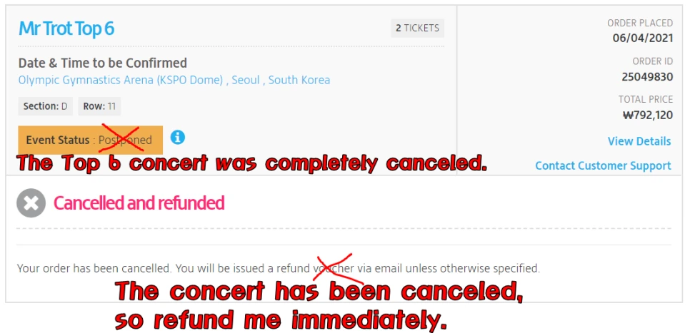 - 피해자는 'Mr Trot Top 6 콘서트‘ 가 취소된 사실과 관련 당시 뉴스에 나온 기사를 4건 이상 복사 및 번역해서 여러 번 보내주었으나 비아고고는 계속 취소된 사실을 통보받은 바 없다는 주장만 되풀이함.