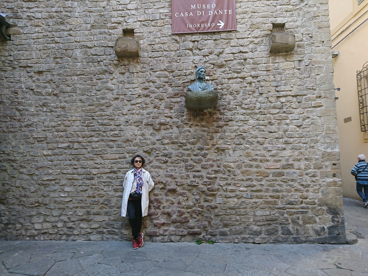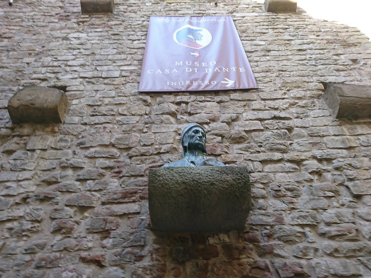골목길을 벗어나기 전 뒤돌아 본, 단테의 집 단테는 정치적 이유로 20여 년 넘게 떠돌이 유랑 생활을 하게 된다. 그는 끝내 이곳 고향 피렌체로 다시 돌아오지 못하고 라벤나에서 생을 마감한다.