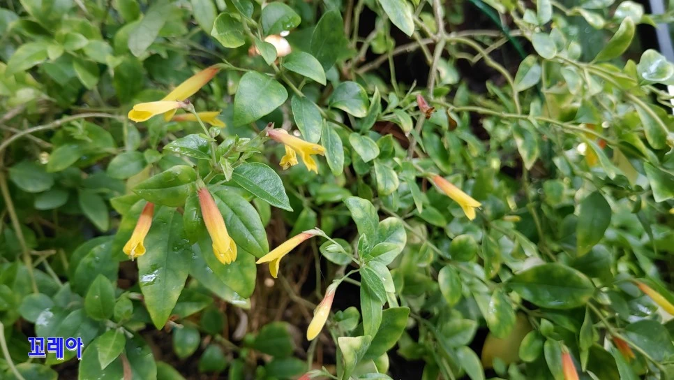 노란색 긴 종 모양의 꽃을 피우는 꼬레아.