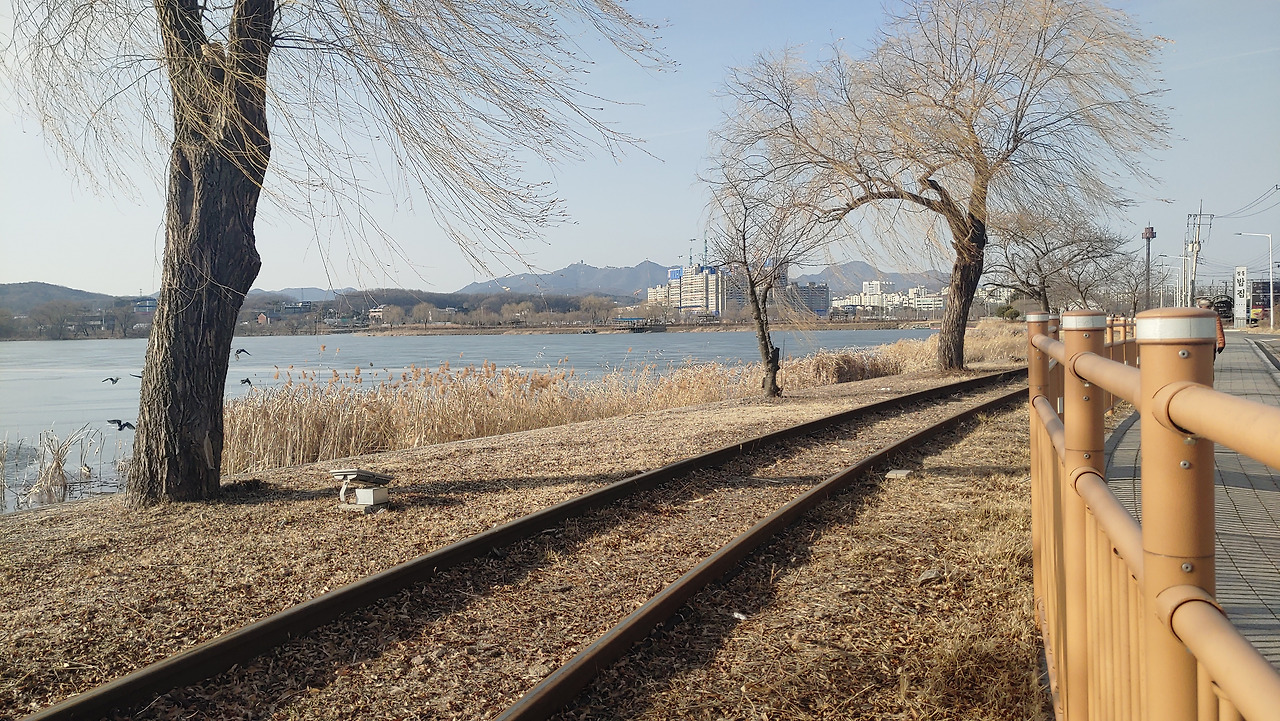 의왕 왕송호수엔 스카이 레일과 바이크 레일이 있지만, 한 겨울 평일(2월 1일)엔 멈춰 선 채로 하늘길도 철로도 한가롭다.