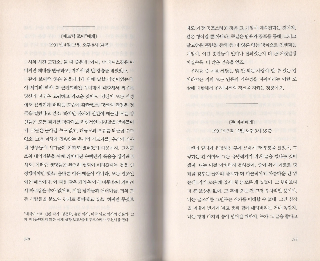 ..... 글쓰기란 죽이게 재미있는 게임이죠. 거절당하면 더 잘 쓰게 되니까 도움이 되고, 수락받으면 계속 쓰게 되니까 도움이 됩니다. 제가 태어난 지도 43년 11일이 됩니다. 스물세 살 때부터 시를 쓰는 건 괜찮아 보여요. 마흔세 살에 뛰어들면 머릿속에 뭔가 약간 비틀린 게 있지 않나 생각하게 될 테지만 그것도 괜찮아요..... 열한 편의 시라니 좋네요. 그렇게 많이 찾아낼 수 있었다니 기쁩니다. 커튼이 내 나라 위에서 국기처럼 흔들리고 맥주는 커다랗죠. (본문 110쪽)