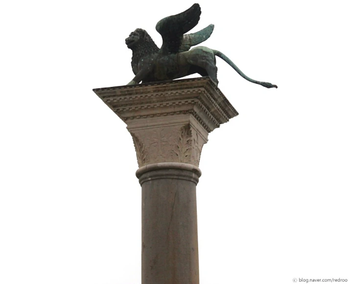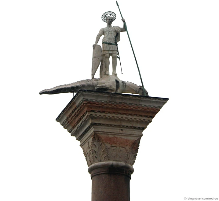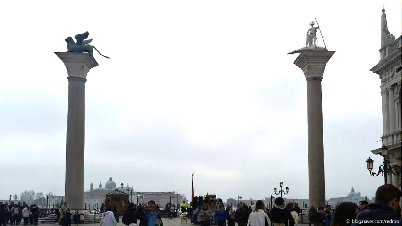 수호성인 성 조지상 / 날개 달린 사자상 - 폰 카메라로 잡히지 않는 원거리 사진은 레드루 DSLR로 찍음 광장에는 멀리 콘스탄티노플에서부터 옮겨온 흰 대리석으로 만든 2개의 원주가 우뚝 서있다. 원주 위에는 베네치아의 상징물과 수호신인 날개 달린 사자와 성 조지상( 성 테오도르상)이 올려다 보인다.