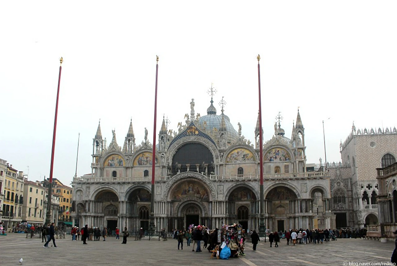 산 마르코 광장은 베네치가 카니발이 열리는 곳이다. 우리가 방문했을 때도 일주일 전에 열렸던 축제의 흔적들이 광장 바닥 여기저기 널려 있었다. 오늘처럼 흐린 날씨에는 3월 초에도 제법 쌀쌀하다. 2월 평균 기온은 최저 0.7℃, 최고 8.2℃라는데, 매년 2월 말이면 이런 성대한 축제를 연다.