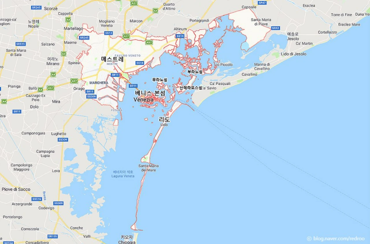 베네치아는 석호, 구시가, 육지로 구분된다. 메스트레 지역을 제외하면, 모두 섬으로 이루어져 있다. 도시 자체가 바다 사이에 끼어 있다고나 할까!