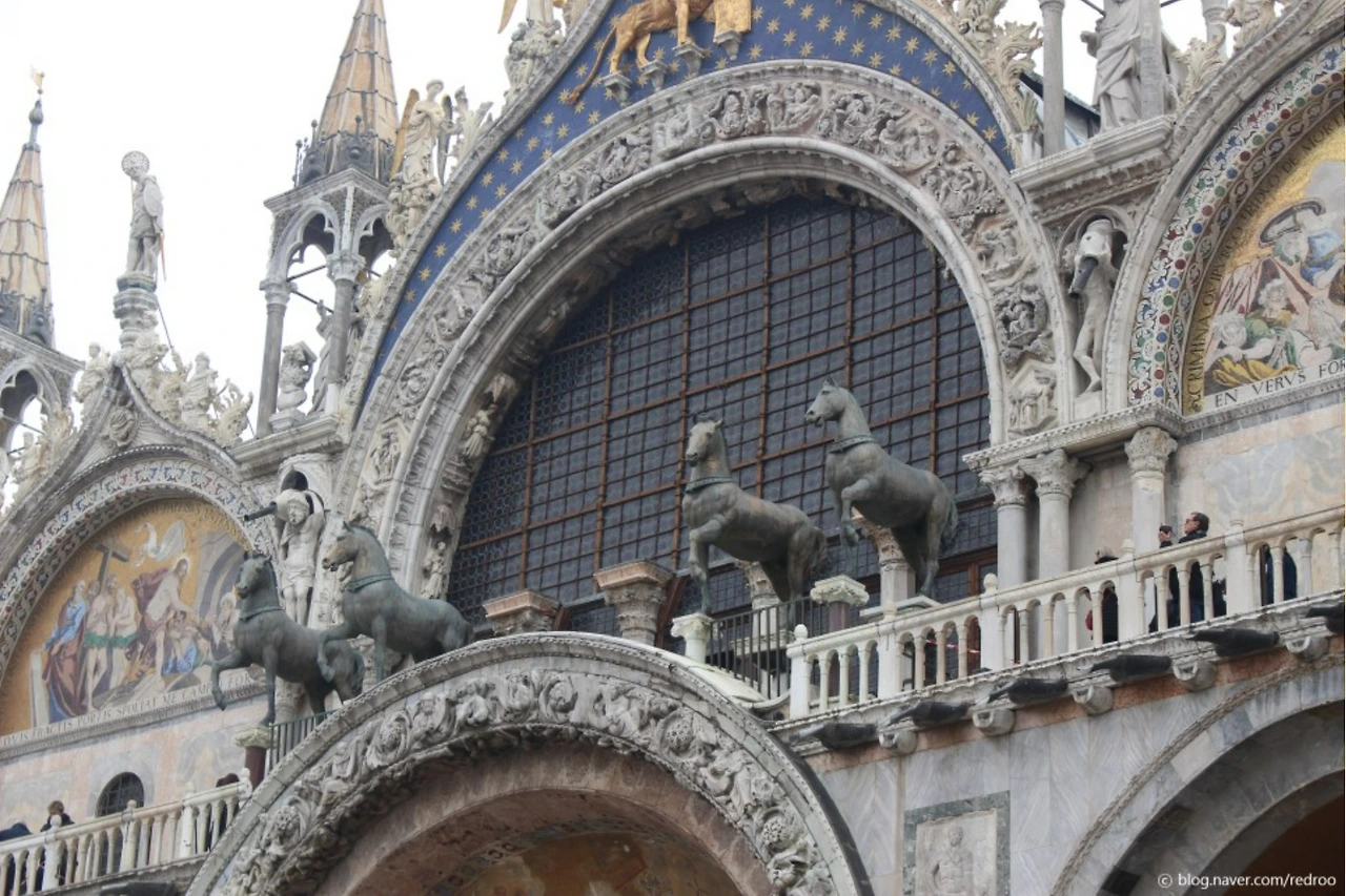 십자군 전쟁 시, 콘스탄티노플에서 약탈해 옮겨놓았다는 기마상 4마리 나폴레옹 보나파르트는 산 마르코 광장을 보고 '유럽에서 가장 아름다운 응접실'이라고 감탄했다. 베네치아 공화국은 나폴레옹에 의해 멸망했다.