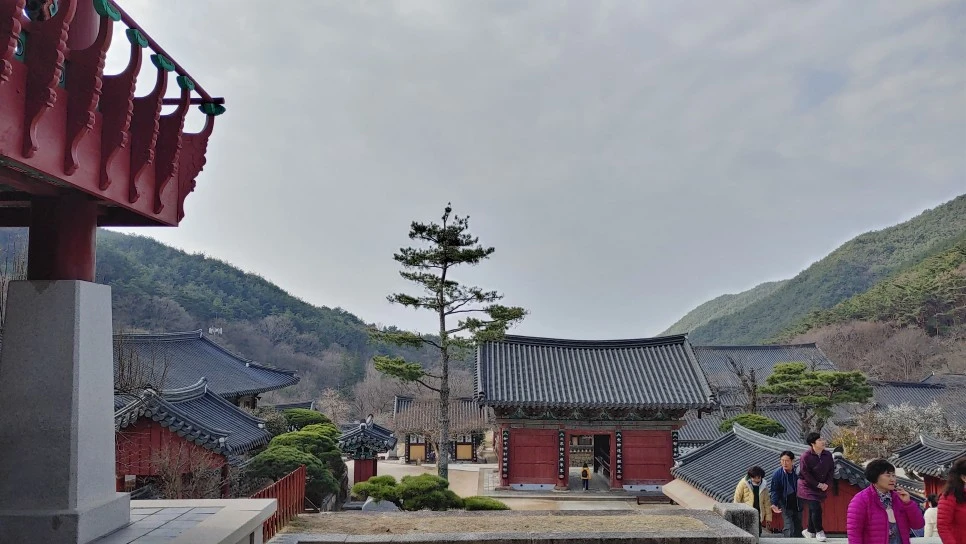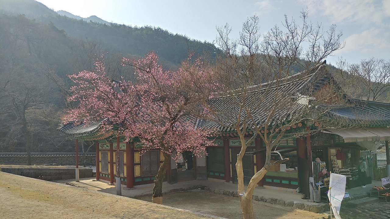 각황전 오른쪽과 나한전 왼쪽 사이에 우뚝 서 있는 홍매화 나무.