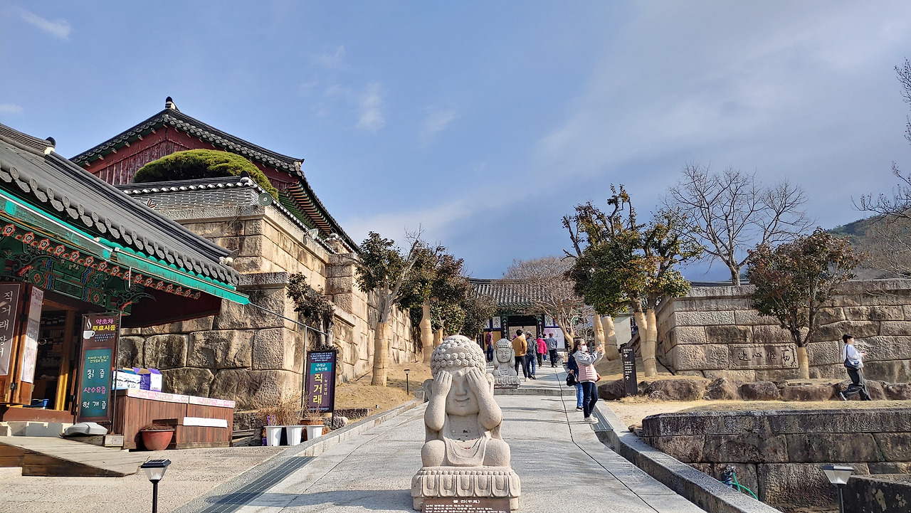 일주문을 지나면, 법구경에 나오는 불견, 불문, 불언을 상징하는 3개의 불상이 있다.