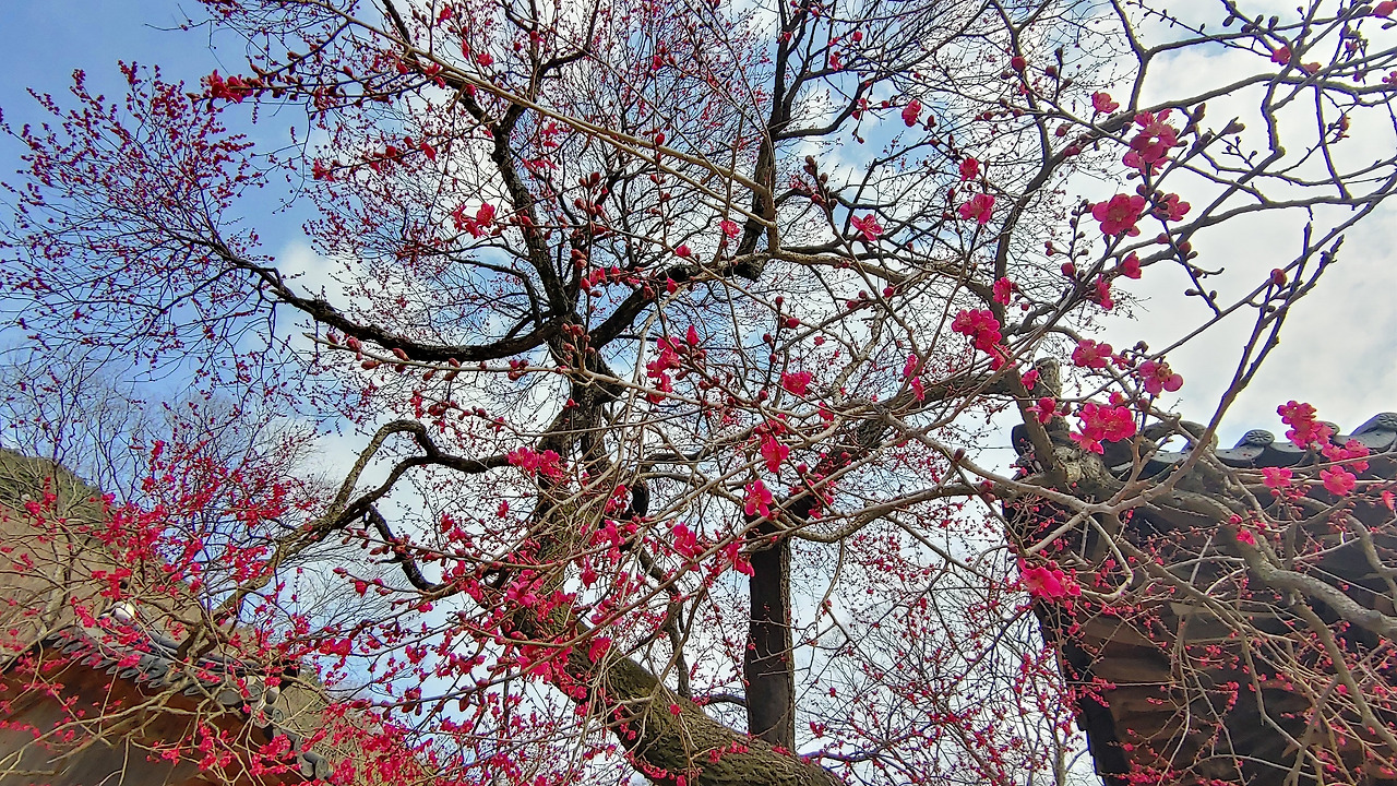 3월 12일, 붉은 홍매화 꽃은 아직 다 피지 못한 꽃봉오리들을 가득 품고 있었다.