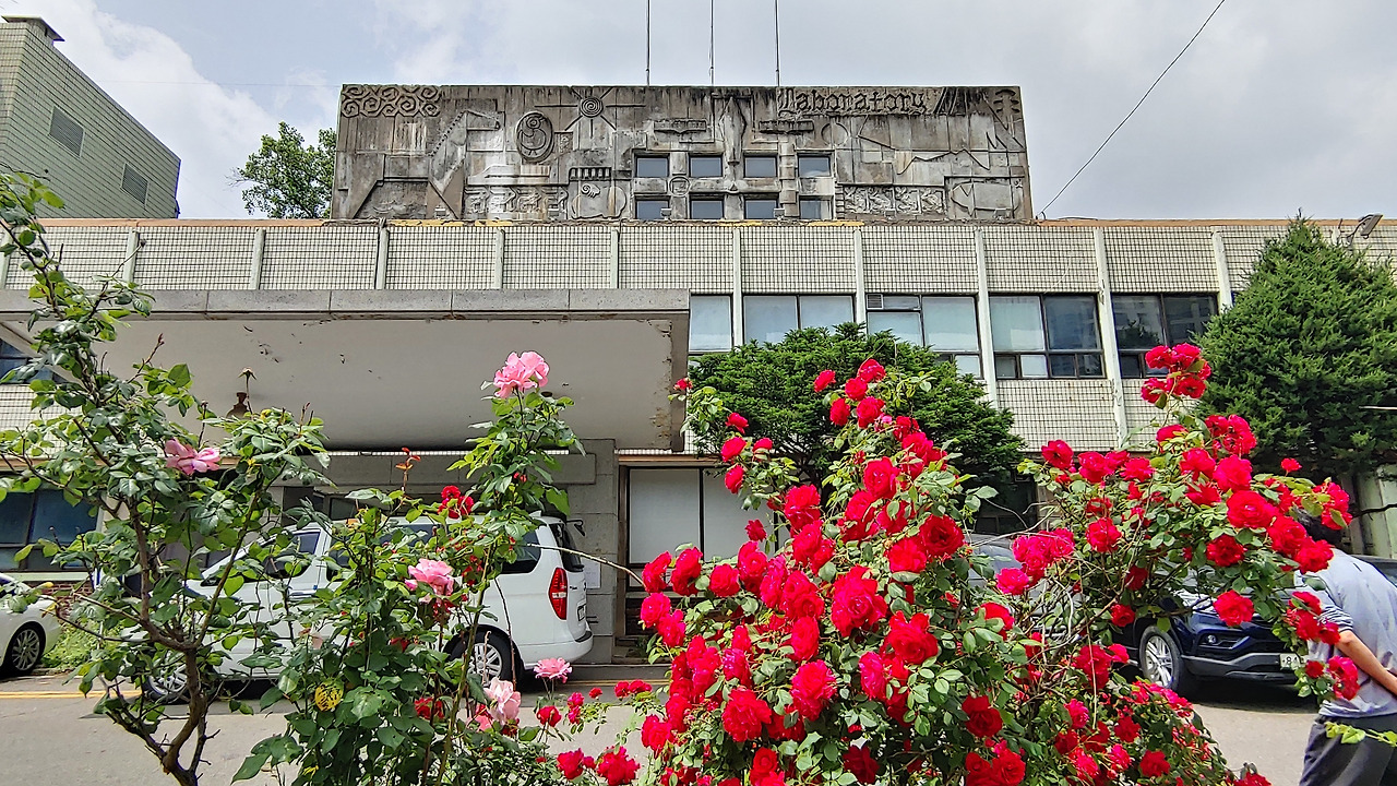 폐쇄된 LABORATORY 본관 앞 만발한 장미꽃