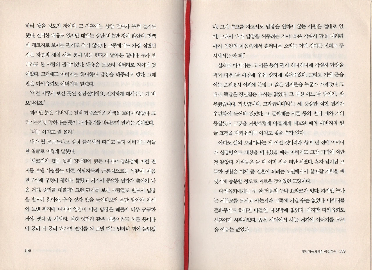 "..... 내(고헤이) 얘기를 누가 들어주기만 해도 고마웠던 일, 자주 있었잖아? 이 사람도 자기 얘기를 어디에도 털어놓지 못해서 힘들어하는 거야. 별로 대단한 충고는 못해주더라도, 당신이 힘들어한다는 건 충분히 잘 알겠다, 어떻든 열심히 살아달라, 그런 대답만 해줘도 틀림없이 마음이 편안해질 거라고." (31쪽)
