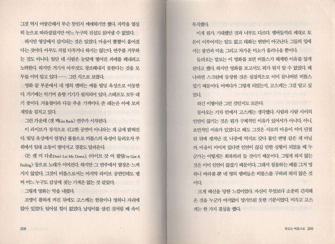 비디오 영상 속의 비틀스는 고스케의 기억과는 조금 달랐다. 옛날에 영화관에서 봤을 때는 그들의 마음이 뿔뿔이 흩어져 있고 연주도 서로 어우러지지 않는 것처럼 느꼈었다. 하지만 지금 이렇게 바라보니 그때와는 전혀 느낌이 달랐다.