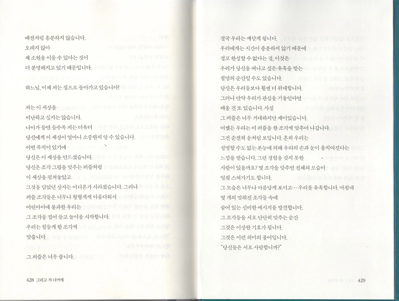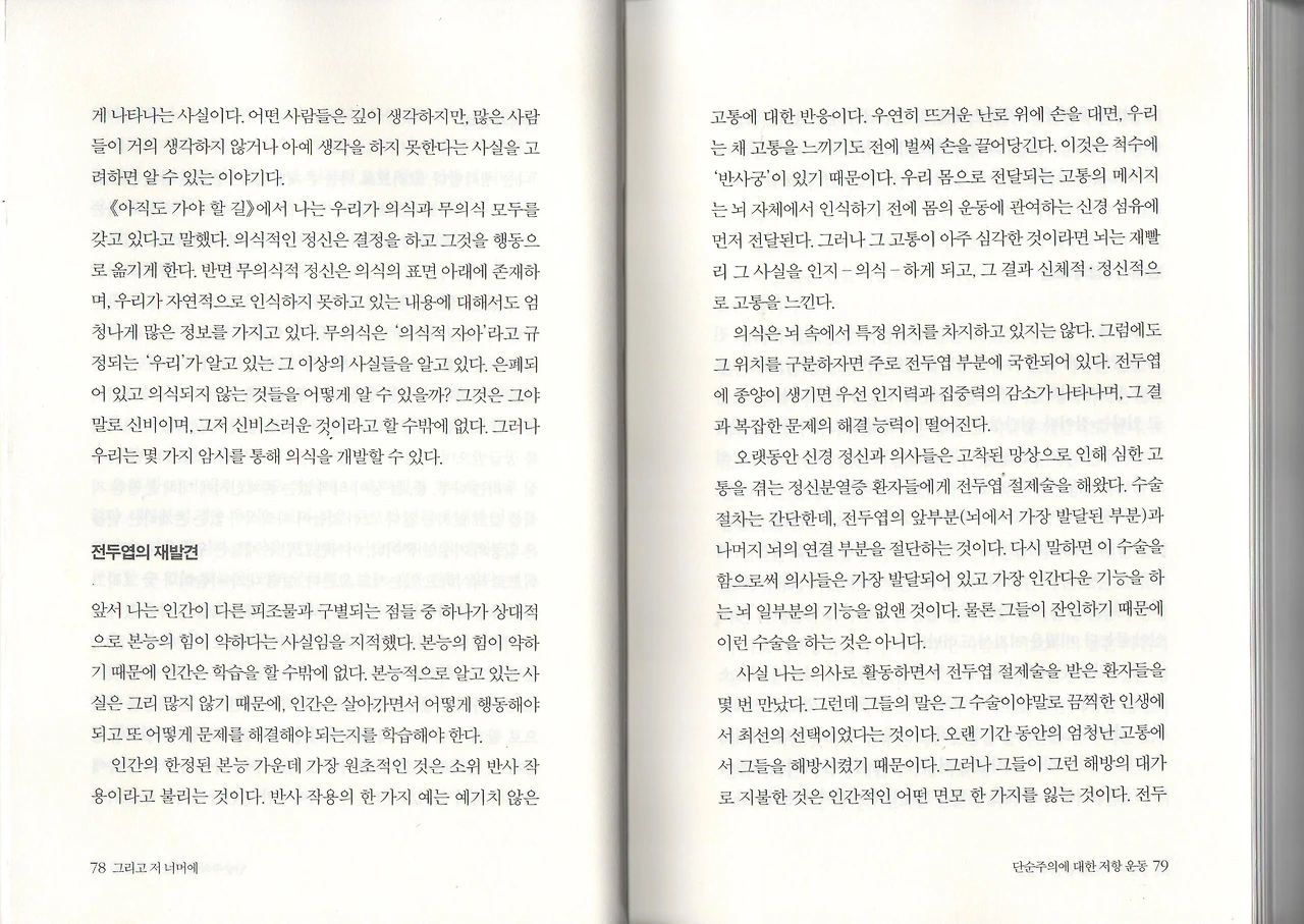 꽤 긴 인생을 살아오면서 개인적으로 제법 깊은 사고와 어느 정도의 통제력을 지니게 됐다고 생각하며 읽었으나, 제3부 '다른 세계'에서는 머뭇거리는 한 사람으로 남아있다.