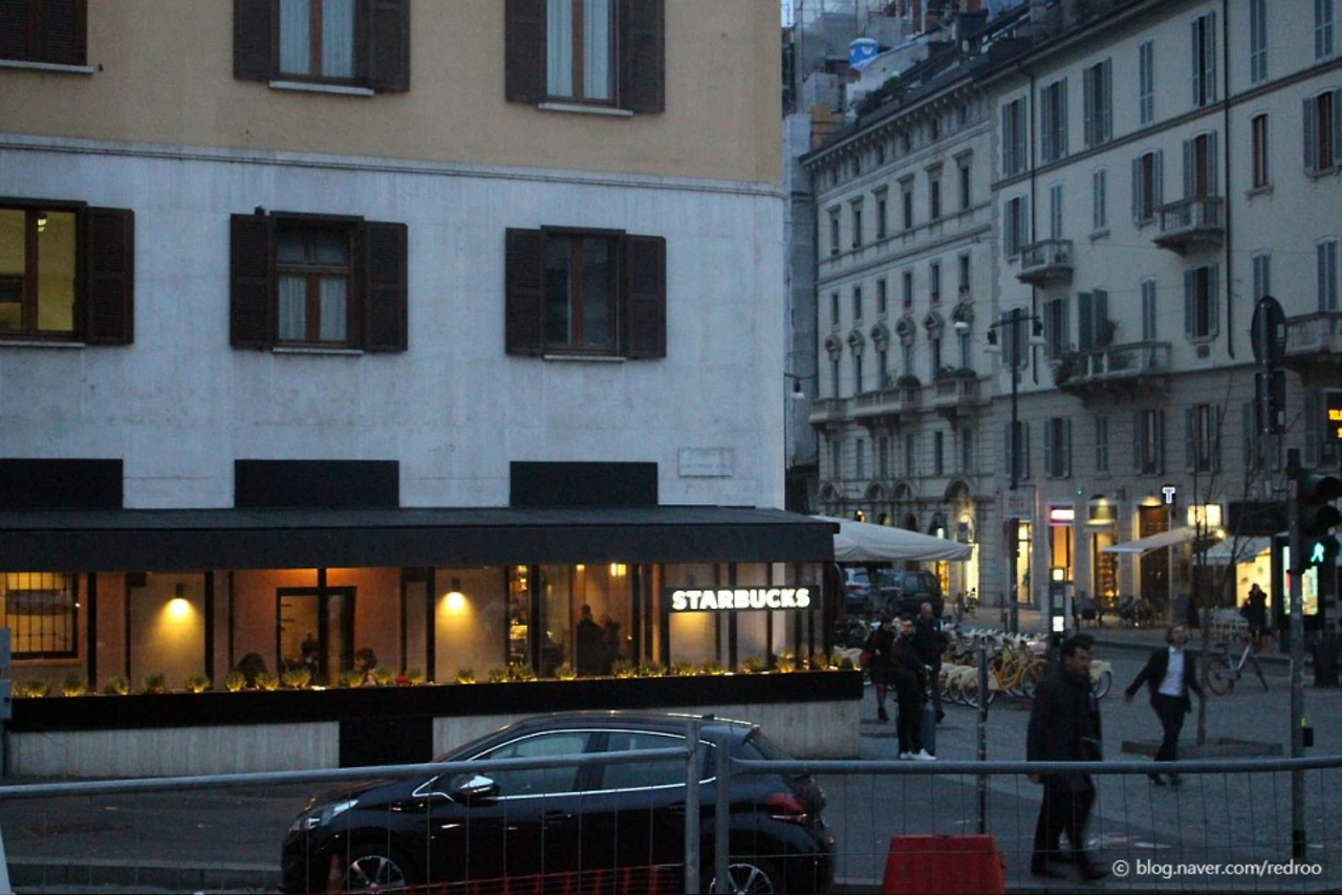 전세버스 타고 숙소로 향하는 길, 차창밖으로 이탈리아 다른 도시에선 못 봤던 스타벅스 매장이 보인다. 이도 밀라노 만의 특별함인가!