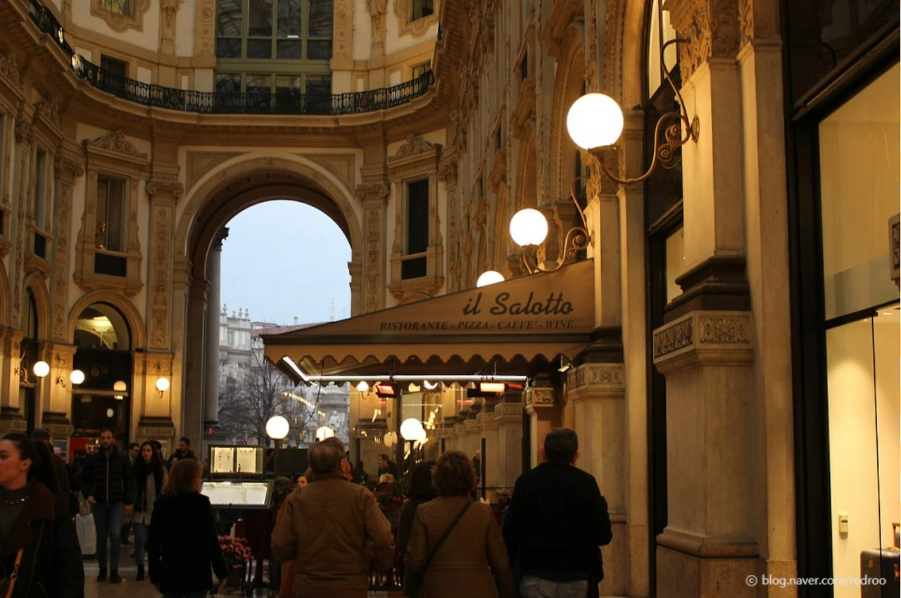 이곳은 세계에서 가장 아름다운 쇼핑거리다. 유행과 패션을 한곳에서 볼 수 있는 아케이드로 두오모 광장에서 스칼라 극장 앞 광장까지 200m 이어진다. 비토리오 엠마누엘레 2세 갤러리아는 건축가 주세페 멘고니 설계로 1865년부터 1877년까지 13년이나 걸려 완성했다.