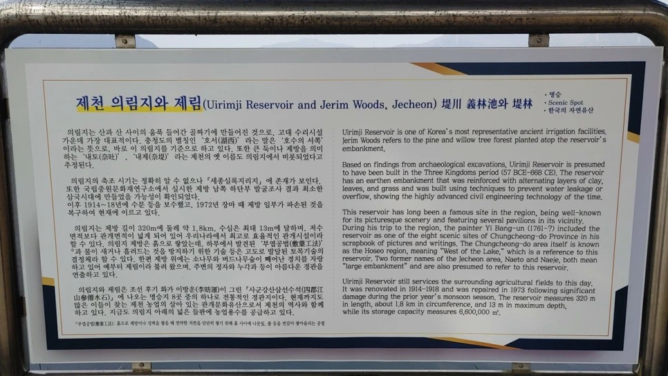 의림지는 우리나라의 대표적 수리시설 중 하나로, 삼한시대부터 있었다고 하니 유구한 역사를 지닌 곳이다.