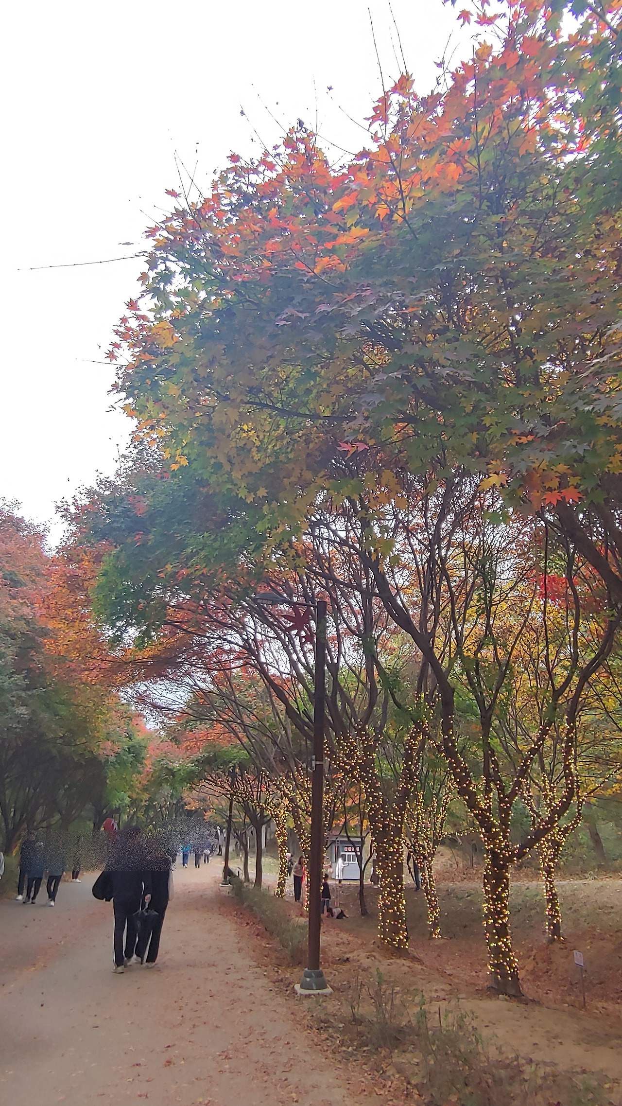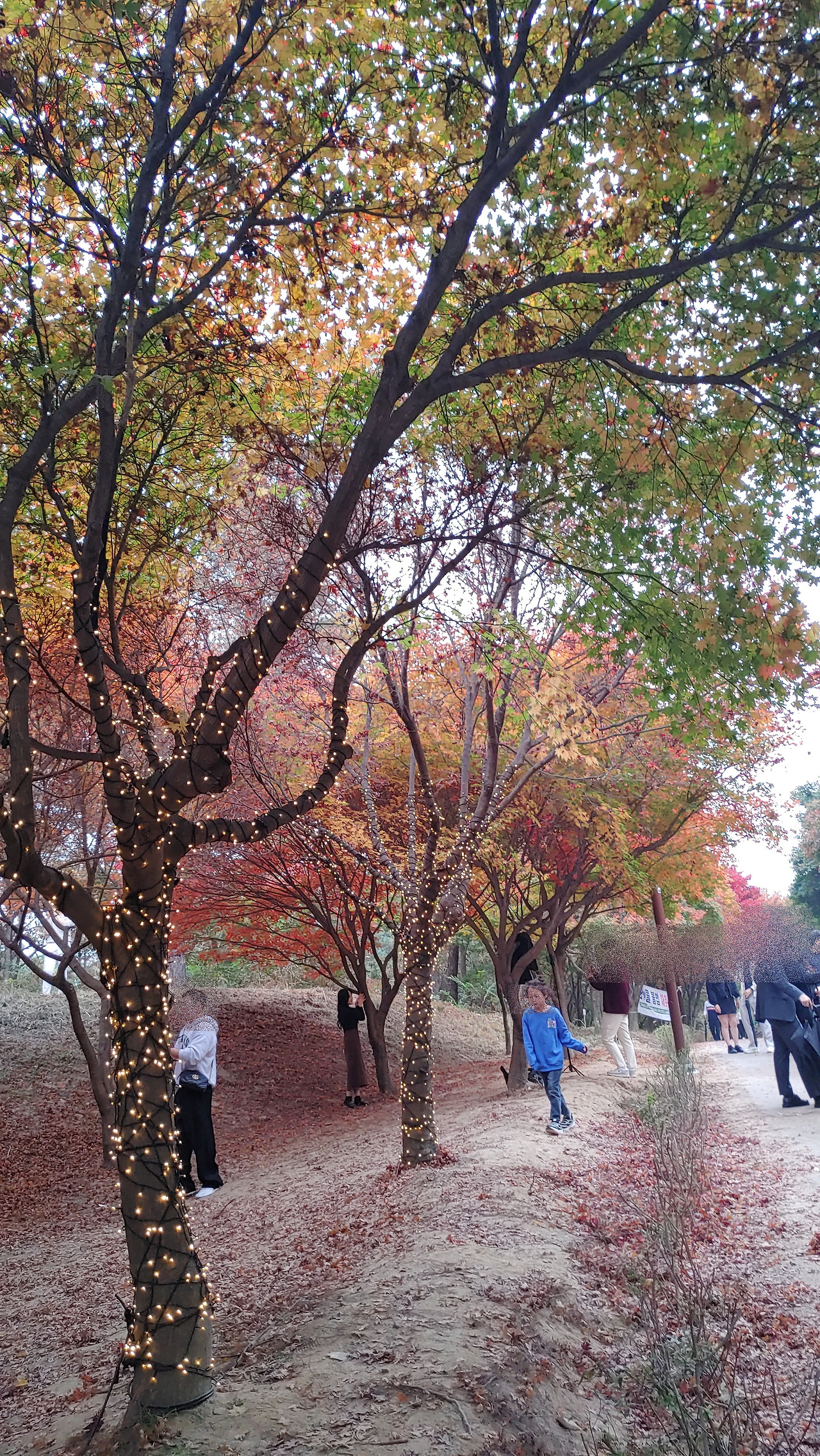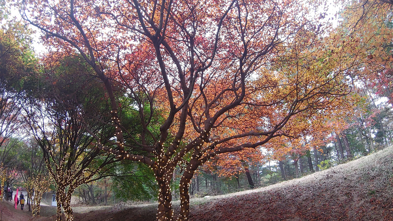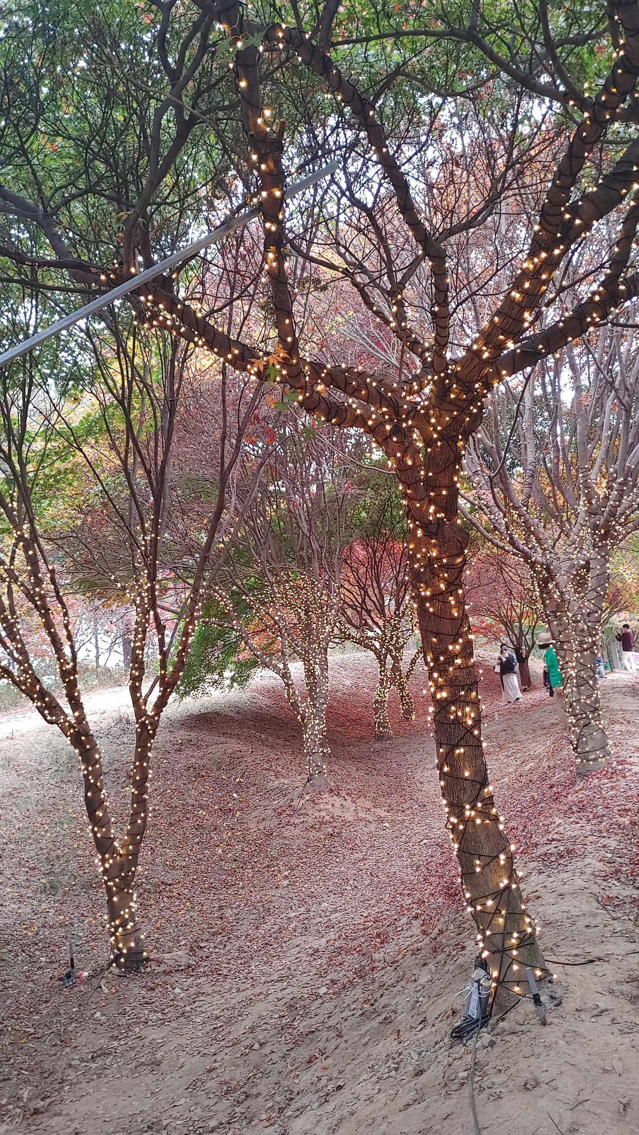 한낮 희미한 어둠 속에서 반짝반짝 빛나는 인공조명과 단풍잎 붉은색의 조화가 다른 세상처럼 신비로워 보였다.