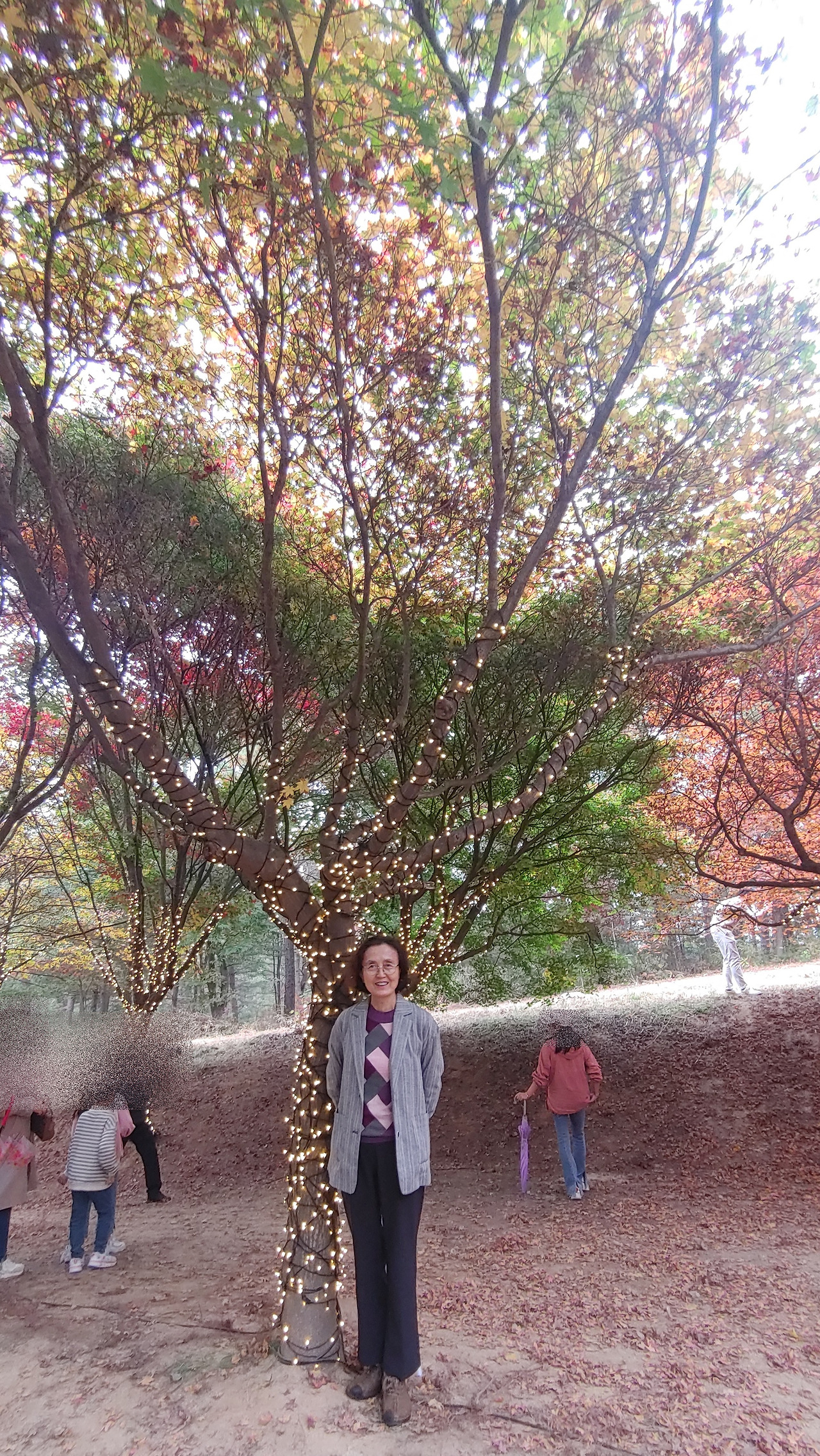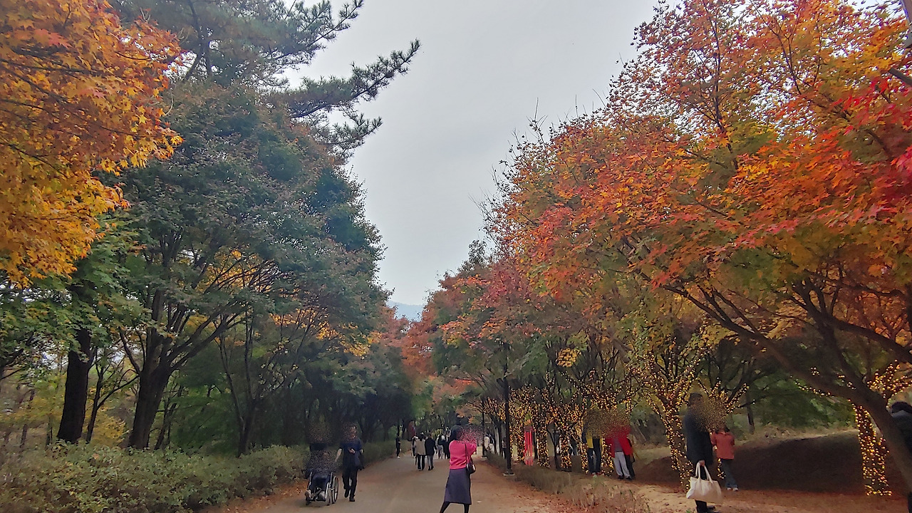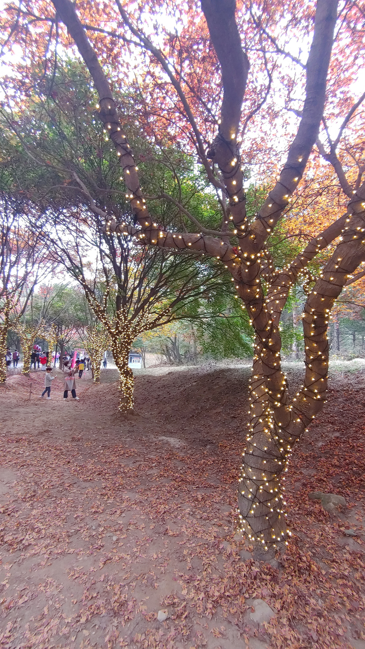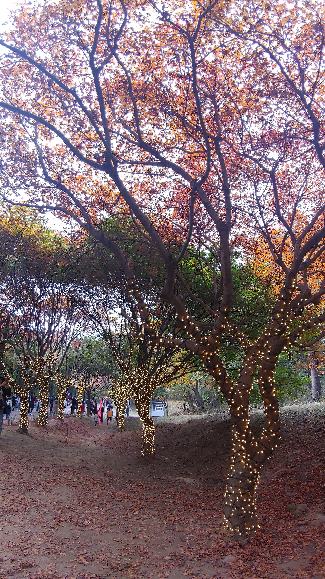 한낮 희미한 어둠 속에서 반짝반짝 빛나는 인공조명과 단풍잎 붉은색의 조화가 다른 세상처럼 신비로워 보였다.