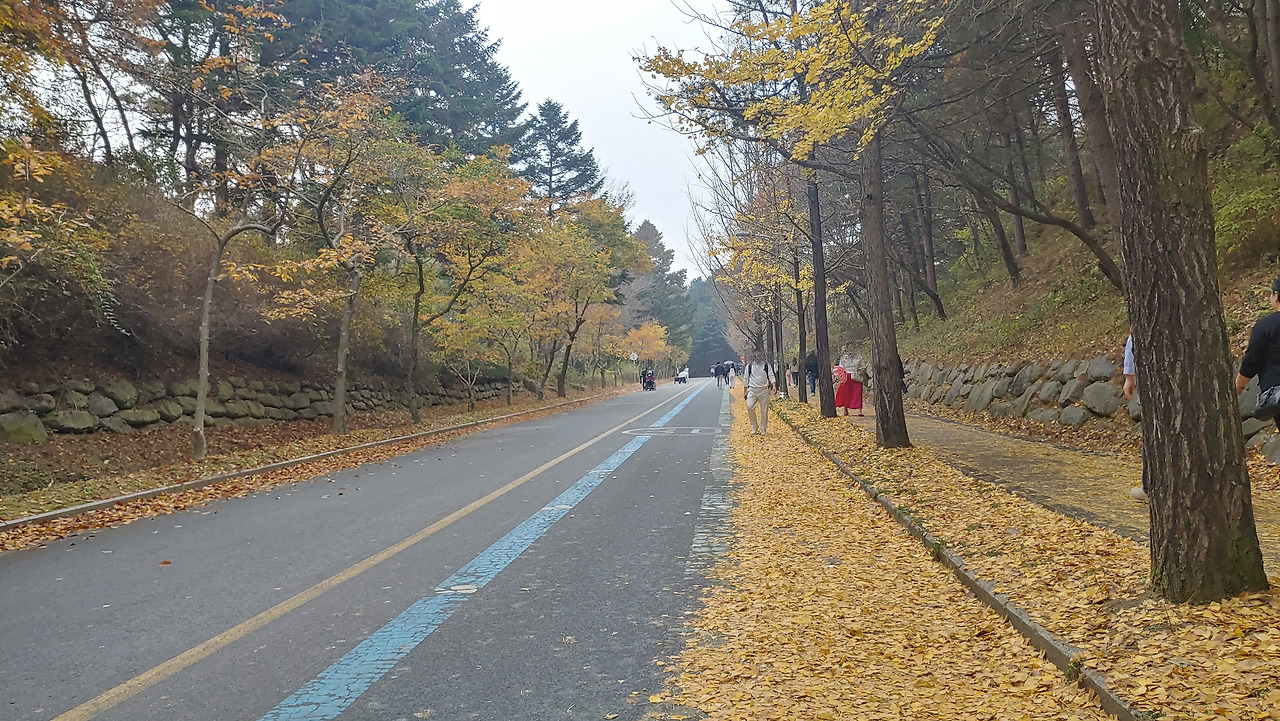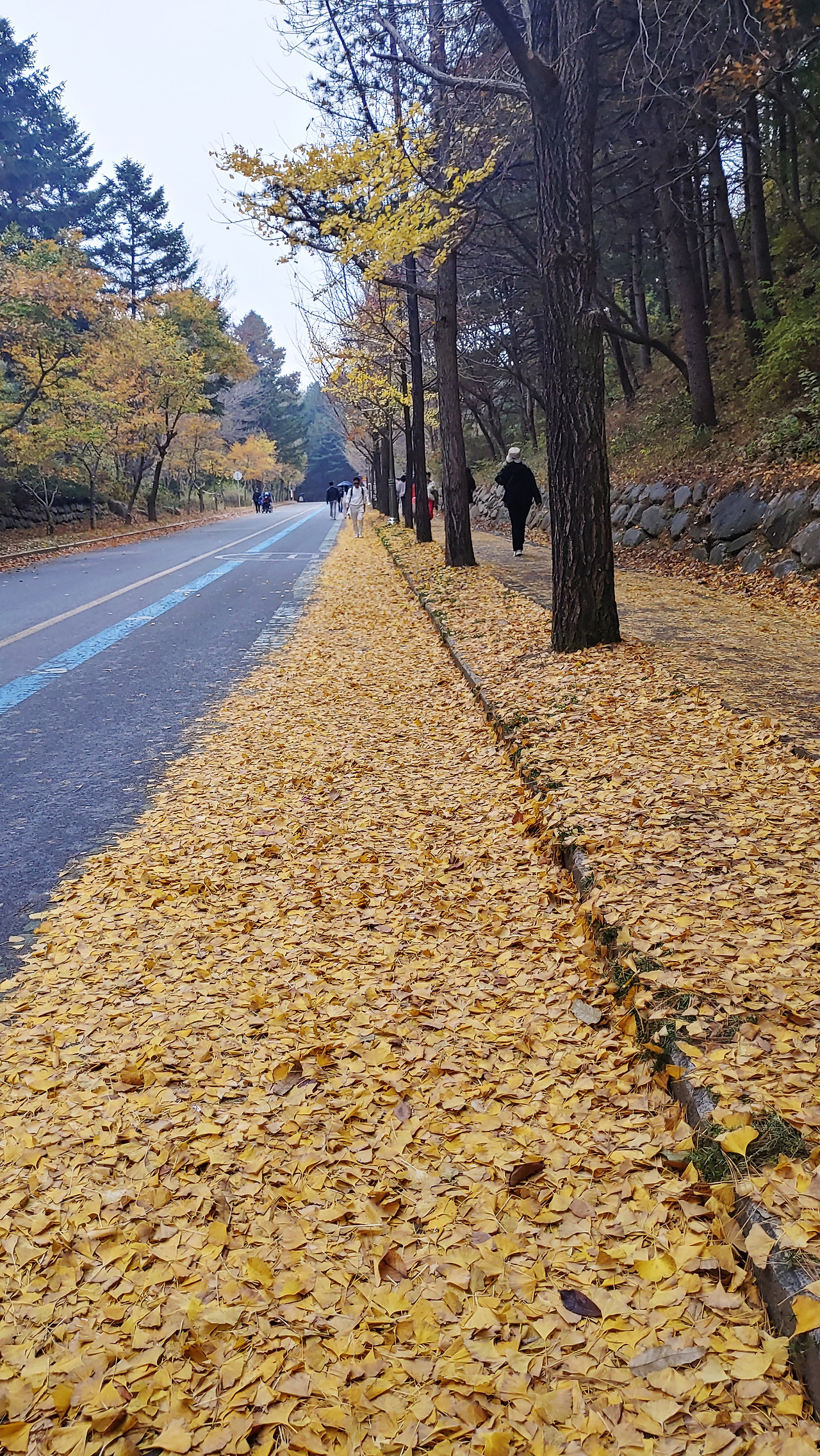단풍나무숲길로 향하는 길가에는 은행나무들이 낙엽을 떨구며 가을비를 맞고 있었다.