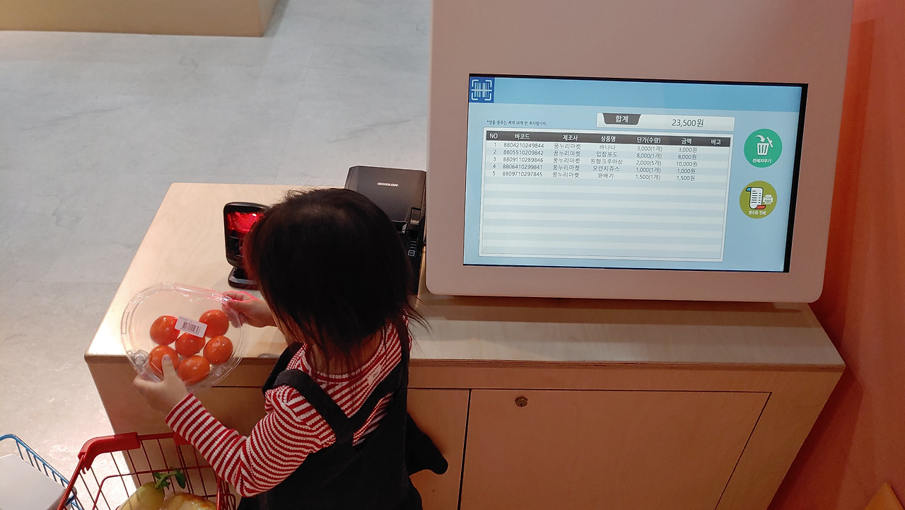 카트에 담긴 물건을 바코드에 대면서 직접 셀프 계산을 하고, 영수증까지 출력해 낼 수 있는 곳이어서 많은 아이들이 좋아하는 체험장이다.