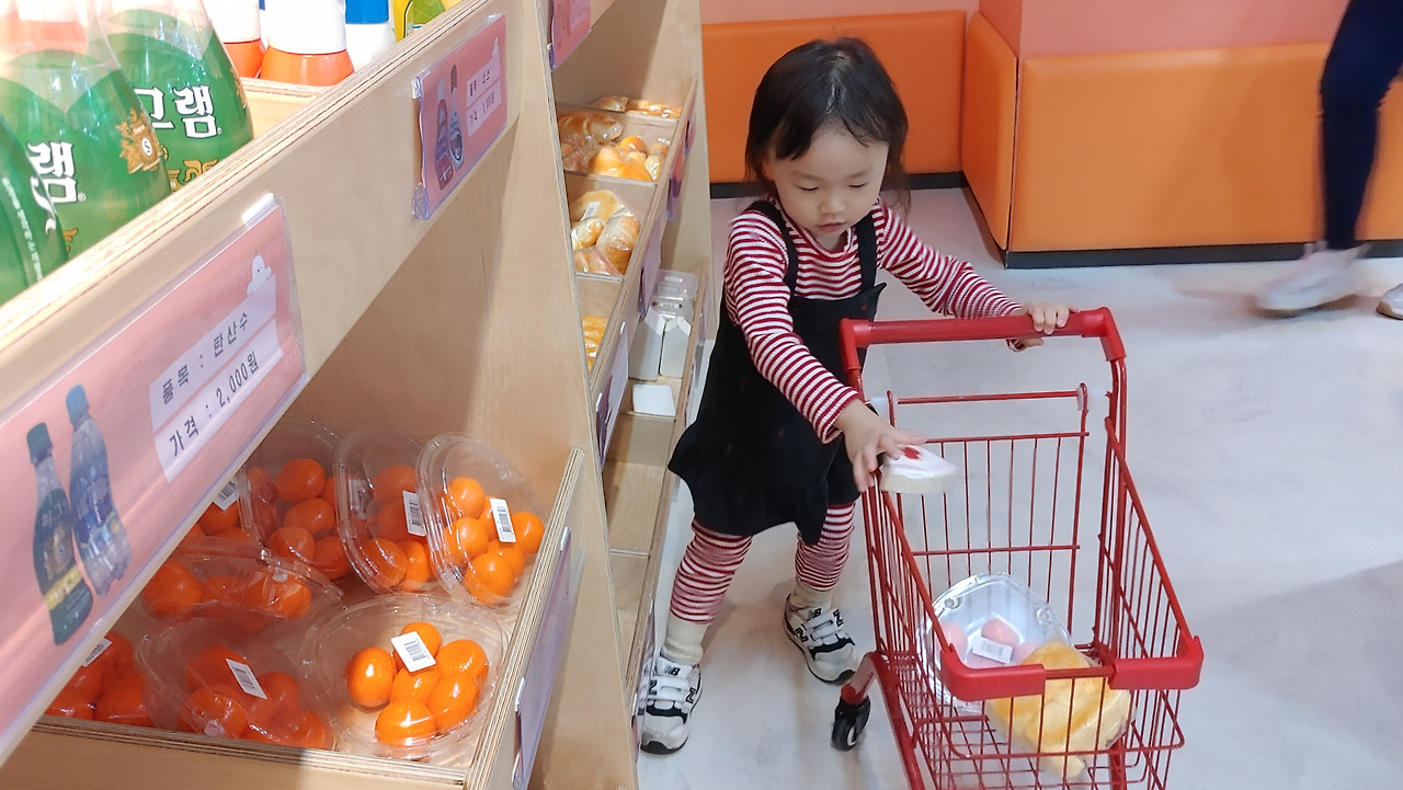꾸미는 어린이용 카트를 직접 끌고 매장을 누비며 자기가 사고 싶은 물건을 마음껏 골랐고, 구입한 물건의 바코드를 직접 대고 찍어 영수증까지 스스로 출력하면서 꽤나 진지했다.