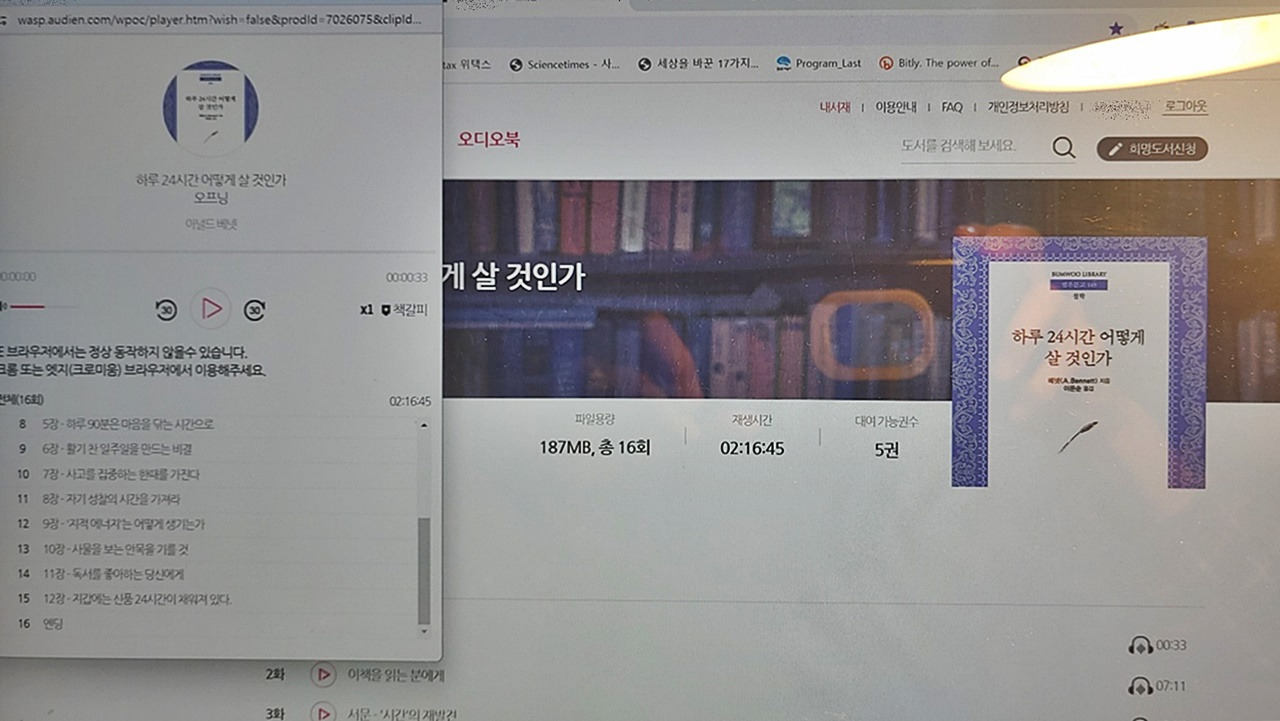 감기로 20여 일 이상 불편한 몸에 치이던 내 정신세계가 마냥 작아 보이고 심지어 하찮아 보였을 때, 시립도서관 전자도서관 오디오북을 찾았다. 감기쯤 하찮게 마주했던 긴 세월이 지나고, 이젠 감기만으로도 휘청거리는 시기에 이르렀다. 2024년 새해부터 하루 24시간이 어찌나 지루게 느껴졌던지...