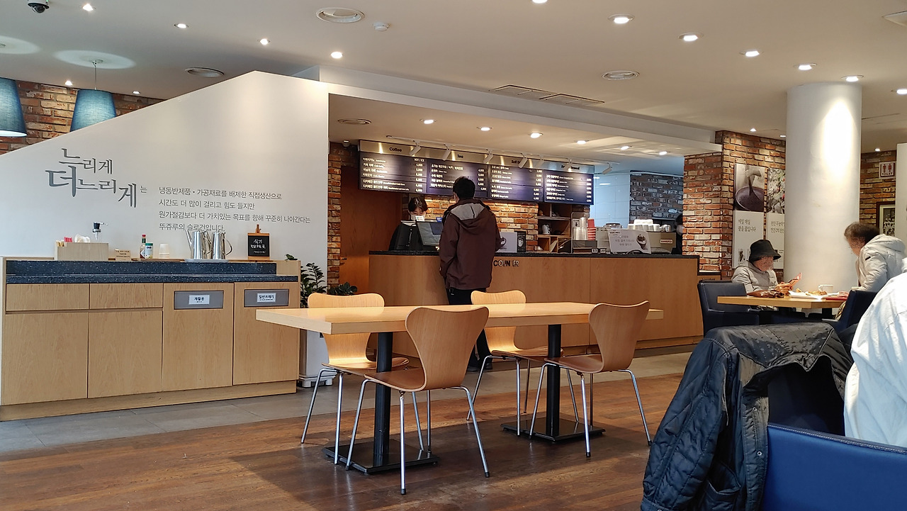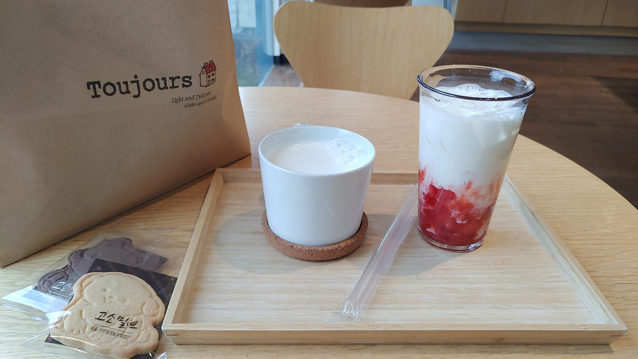 우리는 2층 카페로 올라가 따듯한 우유와 찬 딸기라테를 마시며 잠시 휴식을 취하고 나섰다.