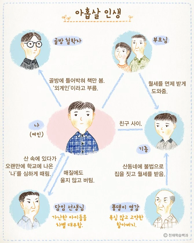 산동네에는 노모가 생선 장사로 벌어오는 돈으로 겨우 생계를 유지하며 수년째 고시 공부만 하고 있는 골방 철학자도 있었다. 사람들은 대학까지 나온 그를 '아무짝에도 쓸모없는 인간'이라고들 했다. 그는 여민에게 짝사랑(?) 편지 심부름을 시키기 위해 접근하면서 여민이가 잘 알아들을 수 없는 이런저런 이야기를 했다. "어른이 되어 보면 세상에 화나는 일이 얼마나 많은지 이해하게 될 거야. 하지만 다른 사람한테 화를 내게 되는 일이 있어도 그건 결국 자신한테 화를 내는 거란다. 자신이 밉기 때문이지. 바로 그렇기 때문에 사람은 자신이 미워지지 않도록 조심해야 해." - 본문 108쪽 - 이 골방 철학자는 부자들이 사는 산 아래 파란 대문 집에서 피아노를 가르치고 있던 윤희 누나를 짝사랑했다. 얼마 후, 골방 철학자는 숲에서 목을 매고 자살함으로써 9살 여민이도 커다란 충격을 받게 된다.