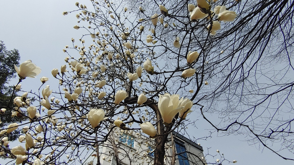 목련이 고운 얼굴을 도도하게 치켜세운다.