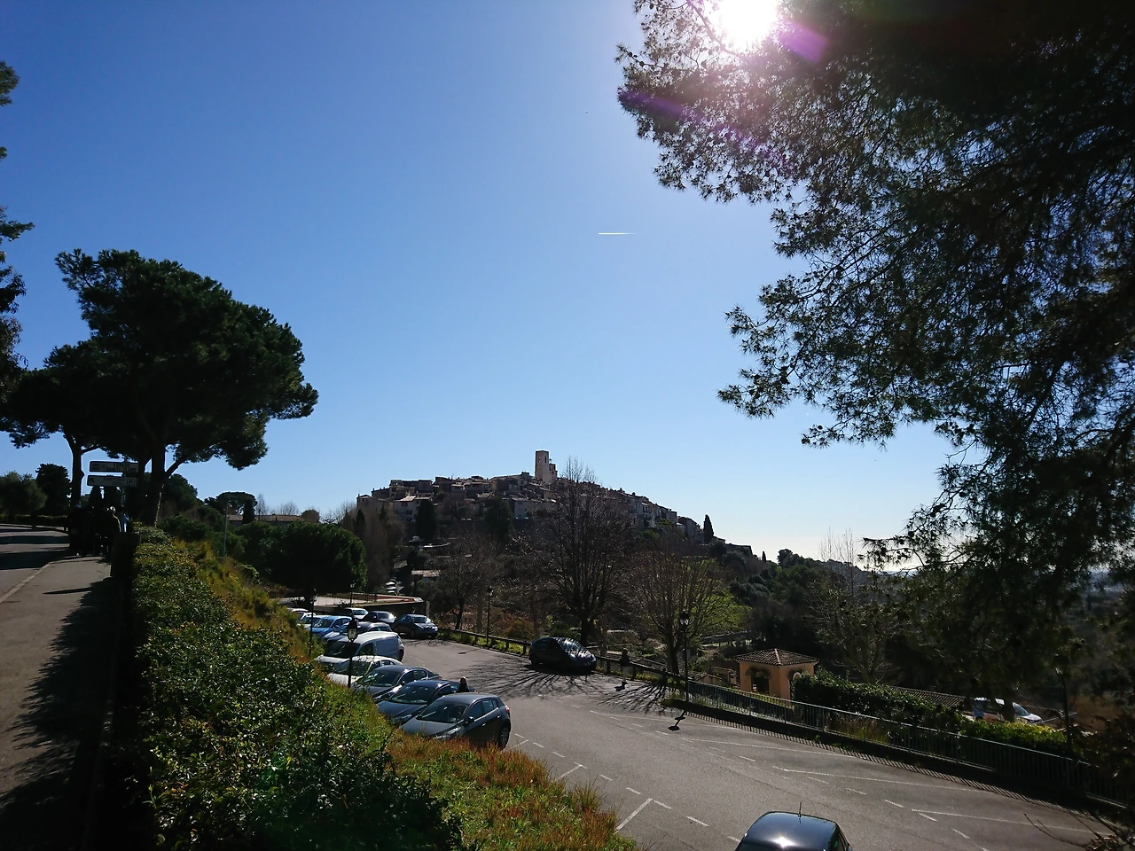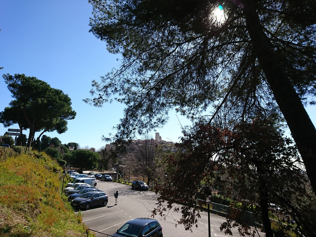 주차장 가운데로 우뚝 솟은 생폴 드 방스 중세 마을이 보인다.
